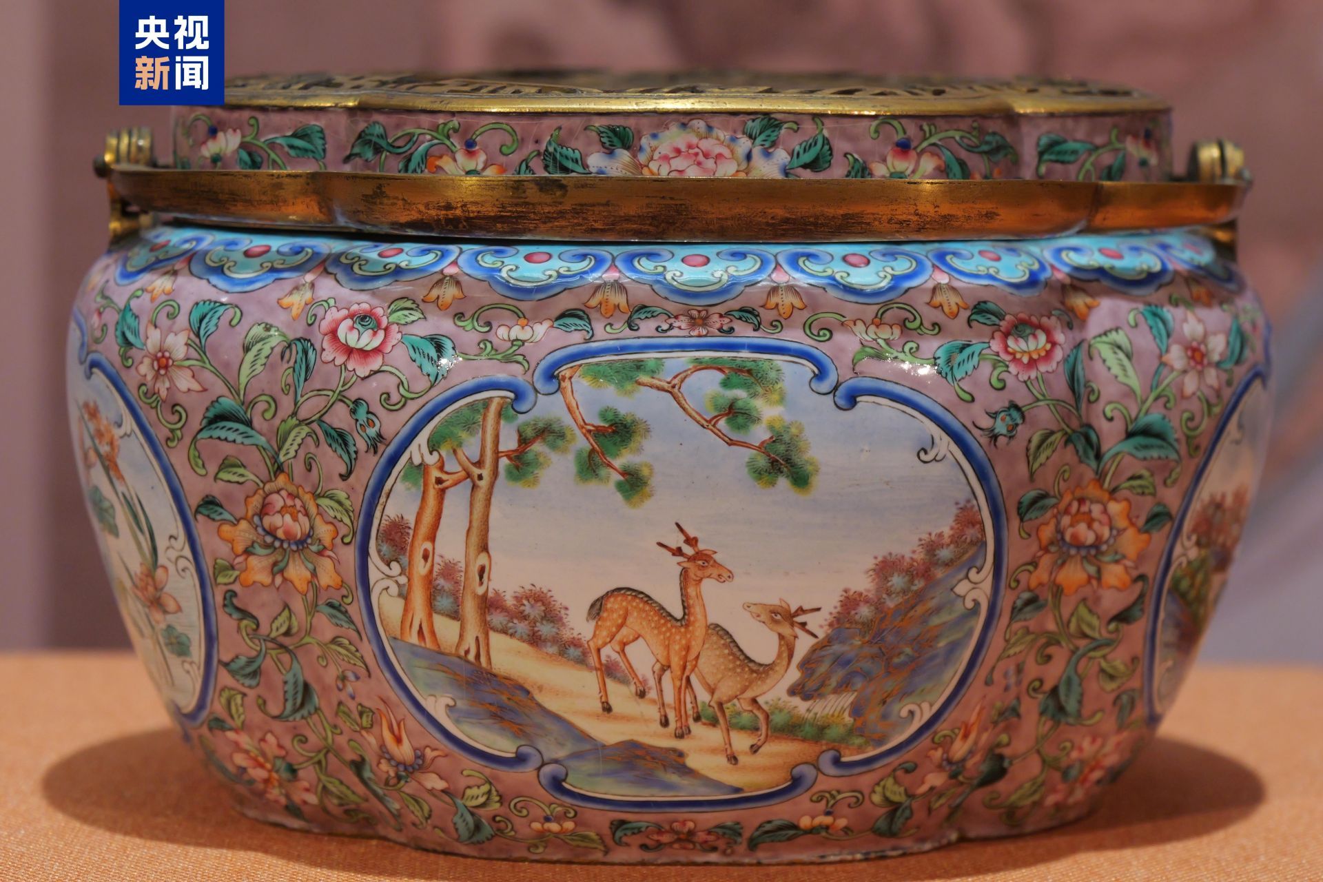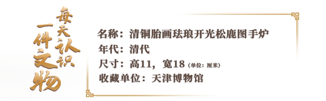 这件清铜胎画珐琅开光松鹿图手炉