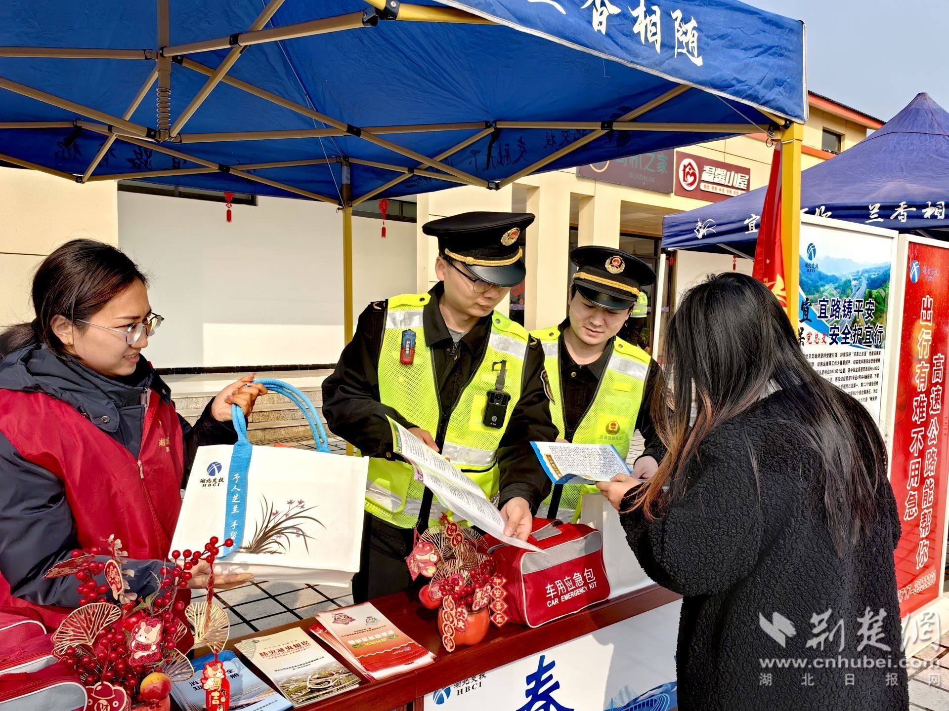 围绕今年的春运主题,“路、警、企”三方在服务区广场开展了春运首日安全宣传与志愿服务活动。通过设置联合咨询台、发放宣传资料、提供便民服务等方式,向过往司乘人员普及冬季行车安全知识,积极营造平安有序的出行环境。