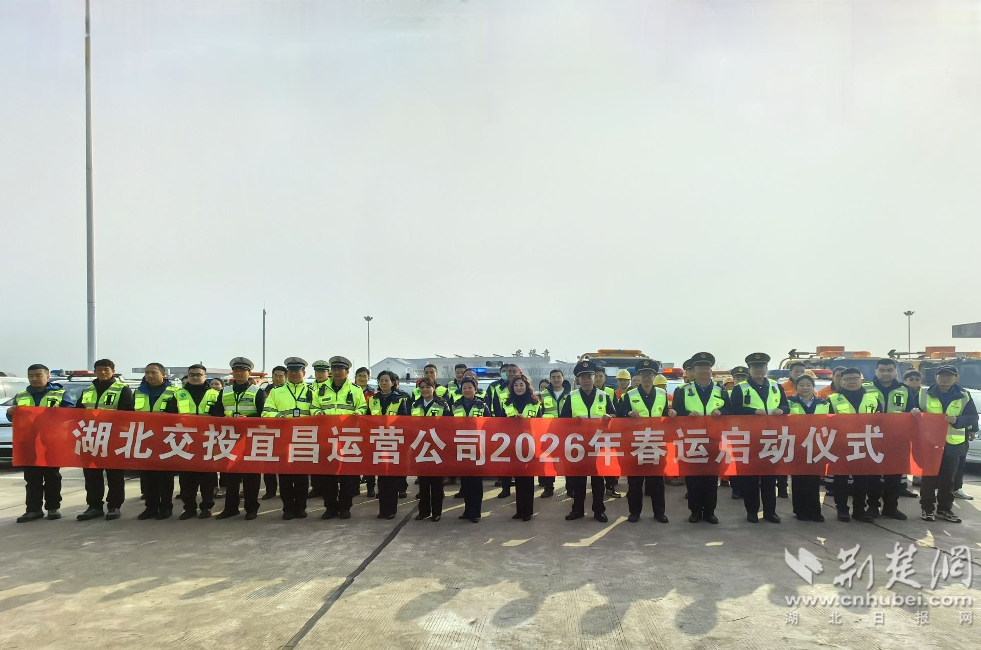 荆楚网(湖北日报网)讯(通讯员施威伟 黄若电 胡哲昊)2026年2月2日,湖北省交通运输综合行政执法总队高速公路路政执法八支队、宜昌市公安局交警支队、湖北交投宜昌运营公司、实业公司联合在G59呼北高速安福寺服务区举办2026年春运启动仪式,共同磋商春运服务保畅措施,集体宣誓全力以赴护航春运出行道路,保障广大司乘群众安全返乡回家。
