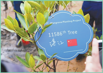 在广东湛江市金沙湾红树林科普基地开展的一场植树活动中,种下的第11586棵树挂上了“身份牌”。
