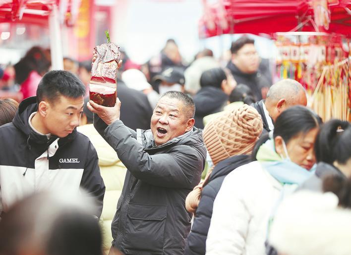 1月26日,荆门市东宝区北门街区年货节上,来自栗溪镇的村民带着自家熏制的腊肉,在摊位前热情地向市民游客推介。 (视界网 赵平 王宇凡 摄)