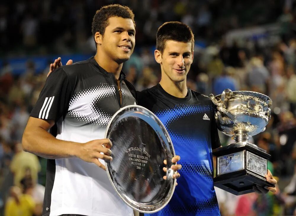 2008年1月27日,塞尔维亚选手焦科维奇(右)在2008年澳大利亚网球公开赛男单决赛中3比1战胜法国选手特松加,夺得冠军。 新华社记者 吕小炜 摄