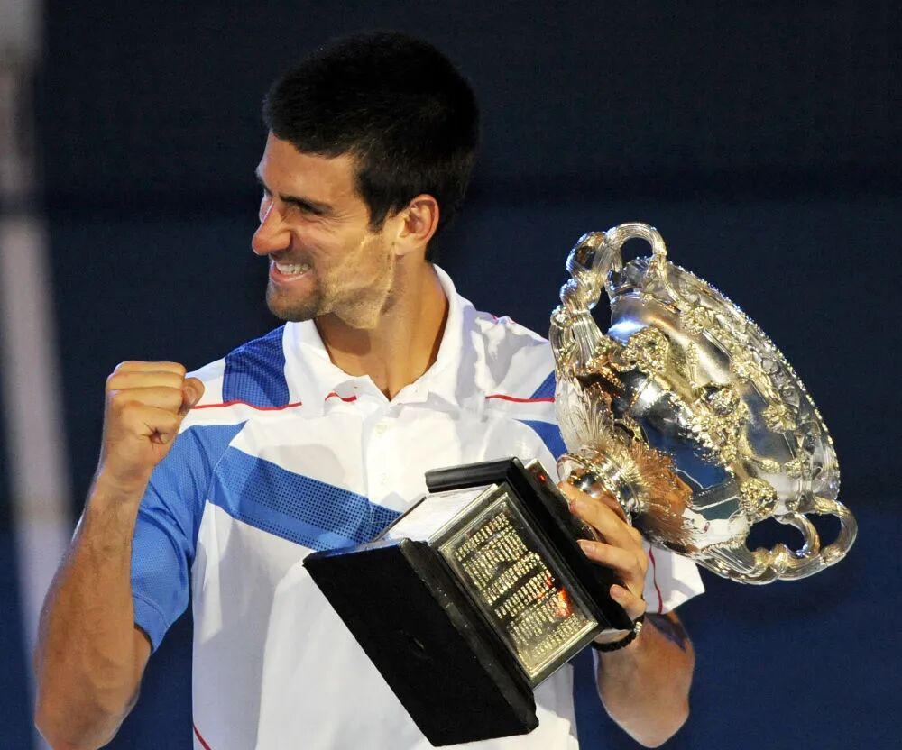 2011年1月30日,塞尔维亚选手焦科维奇在2011年澳大利亚网球公开赛男子单打决赛的颁奖仪式上。新华社记者 陈铎 摄