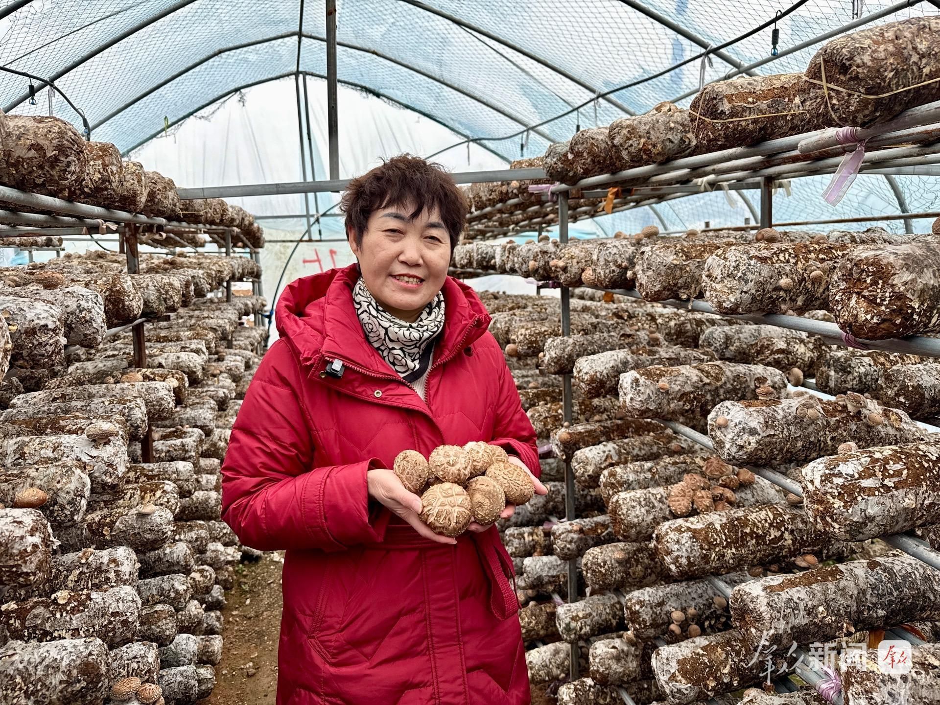 54岁的农场负责人党红俯身查看菌棒,手机上实时显示着棚内数据:温度20.3℃,湿度78%。“要像照顾婴儿一样精细呵护。”她轻轻拿起菌棒,一簇簇香菇密密匝匝,伞盖浑圆,菌褶匀称。