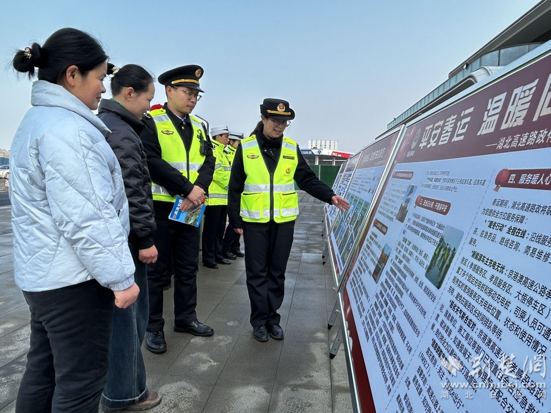 科技赋能,让春运服务更智能、更高效。现场,湖北高速交警孝感大队工作人员积极引导司乘扫码使用“云哨”等智慧出行平台,方便大家实时查询路况、天气及施工信息,持续深化“线上+线下”一体化宣传服务模式。服务区可变情报板滚动播放安全提示与实时路况,助力司乘智能规划行程、避开拥堵路段,提升出行便捷度。