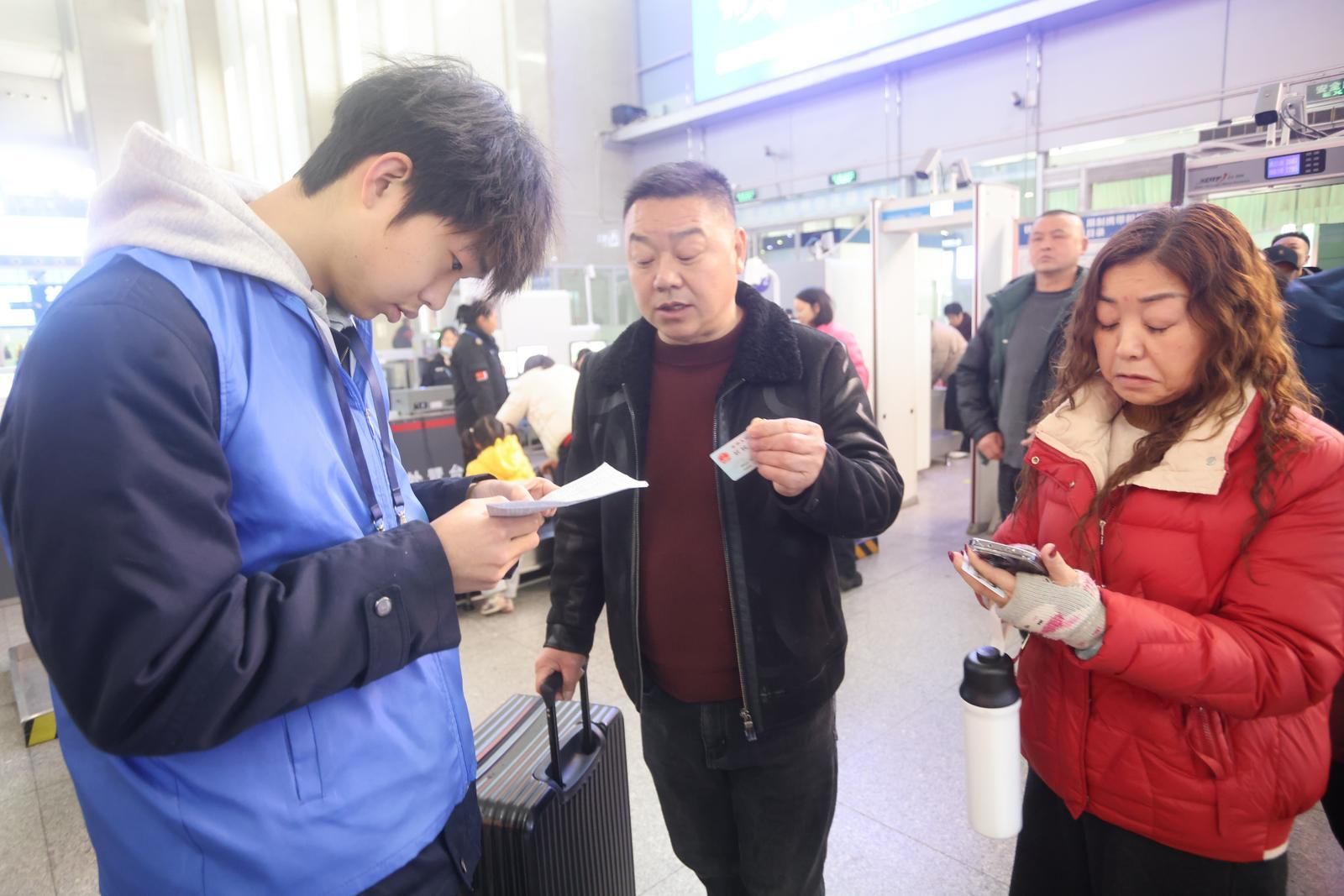面对旅客的各类需求,志愿者们耐心回应、贴心帮扶。从浙江省海宁市返乡过年的吴永杰提着大包小包刚出站,志愿者就主动上前帮她拎包,并将她一路送到公交站台乘车,这让吴永杰心里暖暖的。