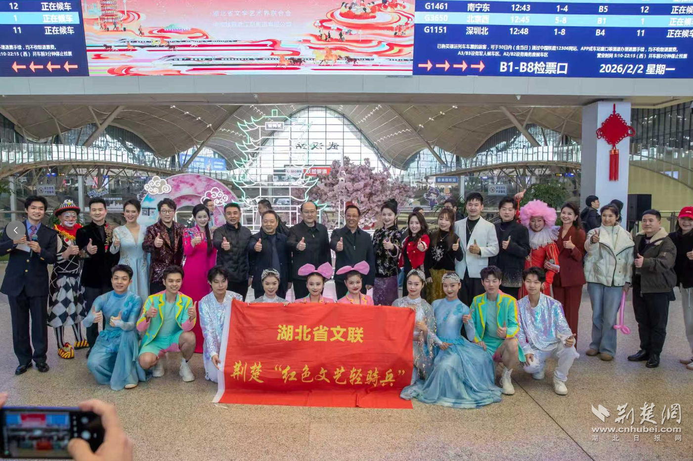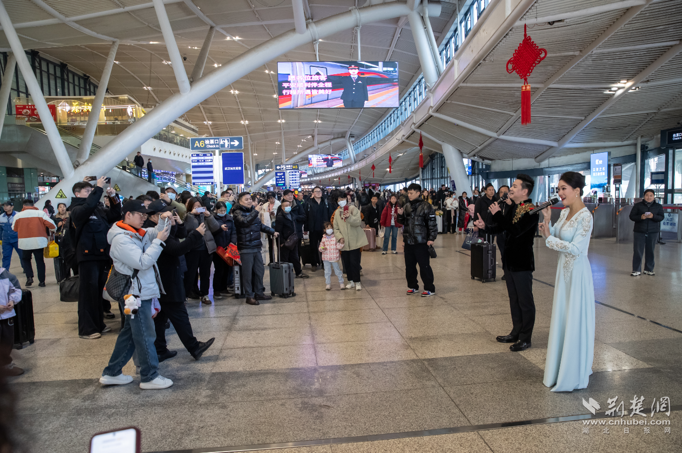 与此同时,多个检票口区域化身为流动的文艺舞台。活动在B1检票口区域以青春洋溢的互动歌曲串烧《燃动青春》拉开帷幕。女主持人方琴以“践行初心永不忘,人民铁路为人民”的亲切问候欢迎旅客,并开启了首轮有奖问答互动,内容涉及文明出行、乘车安全须知等,旅客们踊跃参与,气氛热烈。随后,精彩节目在站内轮番上演:在B6检票口,青年演员胡启文、任小欢带来的滑稽剧《欢乐大使》引得旅客笑声不断;在A6检票口,湖北戏剧“牡丹花奖”获得者曹祝来与全国“黄梅之星”金奖获得者沈海燕联袂献上经典黄梅戏选段《对花》、《夫妻双双把家还》,婉转的唱腔唤起浓浓乡情;由武汉站客运员杨凡与家人演绎的原创歌曲《欢迎回家》,则道尽了铁路人对旅客如家人般的守望;A1检票口区域,武汉电信艺术团器乐组合刘琴、朱睿淇、蔡鑫带来的器乐三重奏《我的祖国》,以激昂深情的旋律致敬锦绣山河。活动最终在西进站口全体演员与旅客共唱《恭喜发财》的温暖歌声中圆满落幕,主持人们送上“旅途平安、阖家团圆、马年大吉”的美好祝愿。