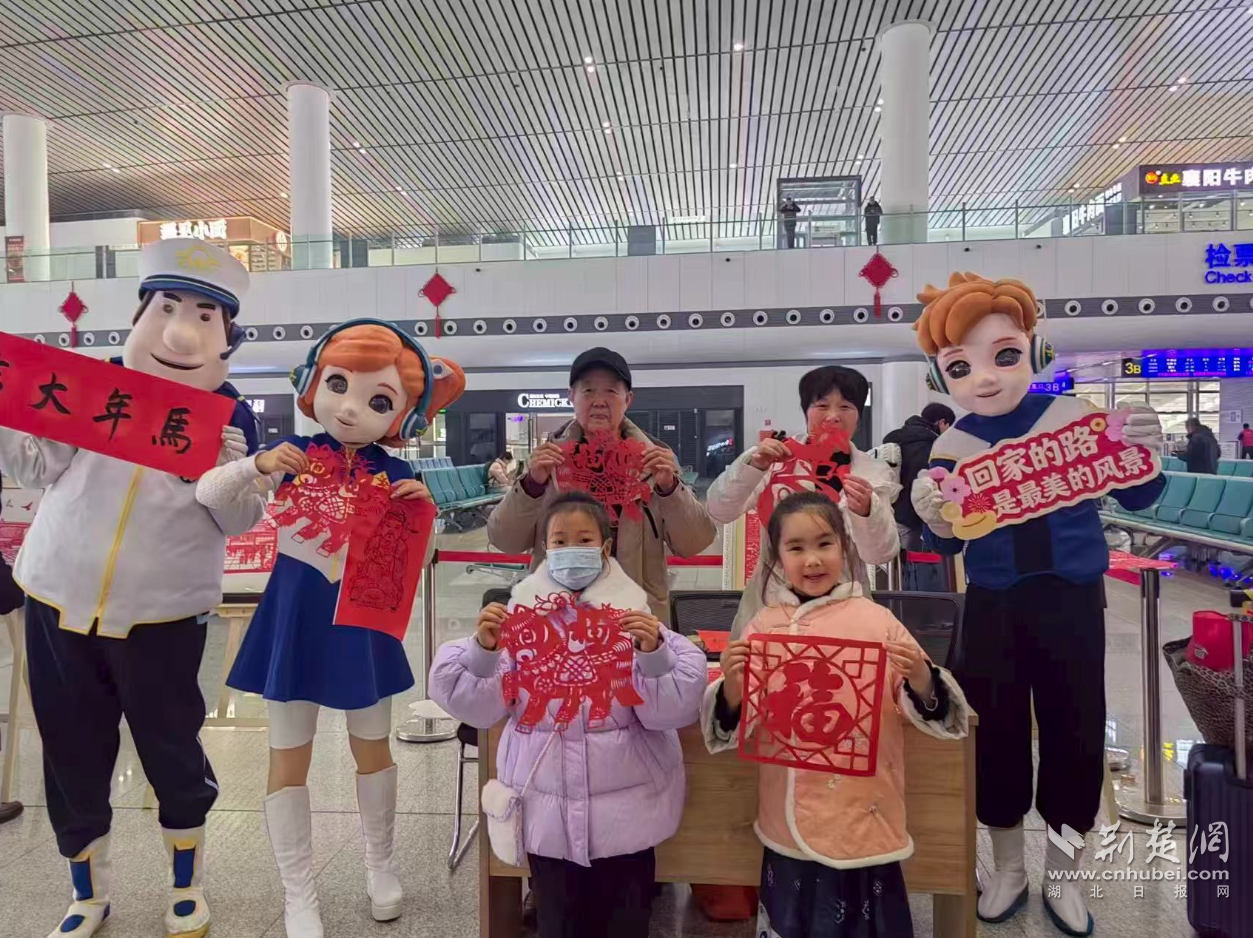百年老站汉口火车站的文化年味体现在翰墨书香与非遗技艺中。站内一抹独特的文化气息悄然弥漫,数十张桌子井然有序的排列着,李成荣、周大春、唐汝元、张德春、陈永明、殷进、侯庆华、罗昭莲、李欣等书法家们一边和来往旅客交流一边在纸上挥毫泼墨,或楷书工整,或行书流畅,或草书奔放,将一幅幅寓意吉祥、寄托祝福的春联呈现在众人面前。一问一答、一笔一划间流露出对新春的美好祝愿,也为旅客们回家的路途增添了一份熟悉与亲切。非遗展台上,剪纸、面塑等非遗项目吸引了大量旅客尤其是孩子们的目光,非遗传承人余华、张露文与旅客亲切互动,让候车时光成为生动的文化体验课。