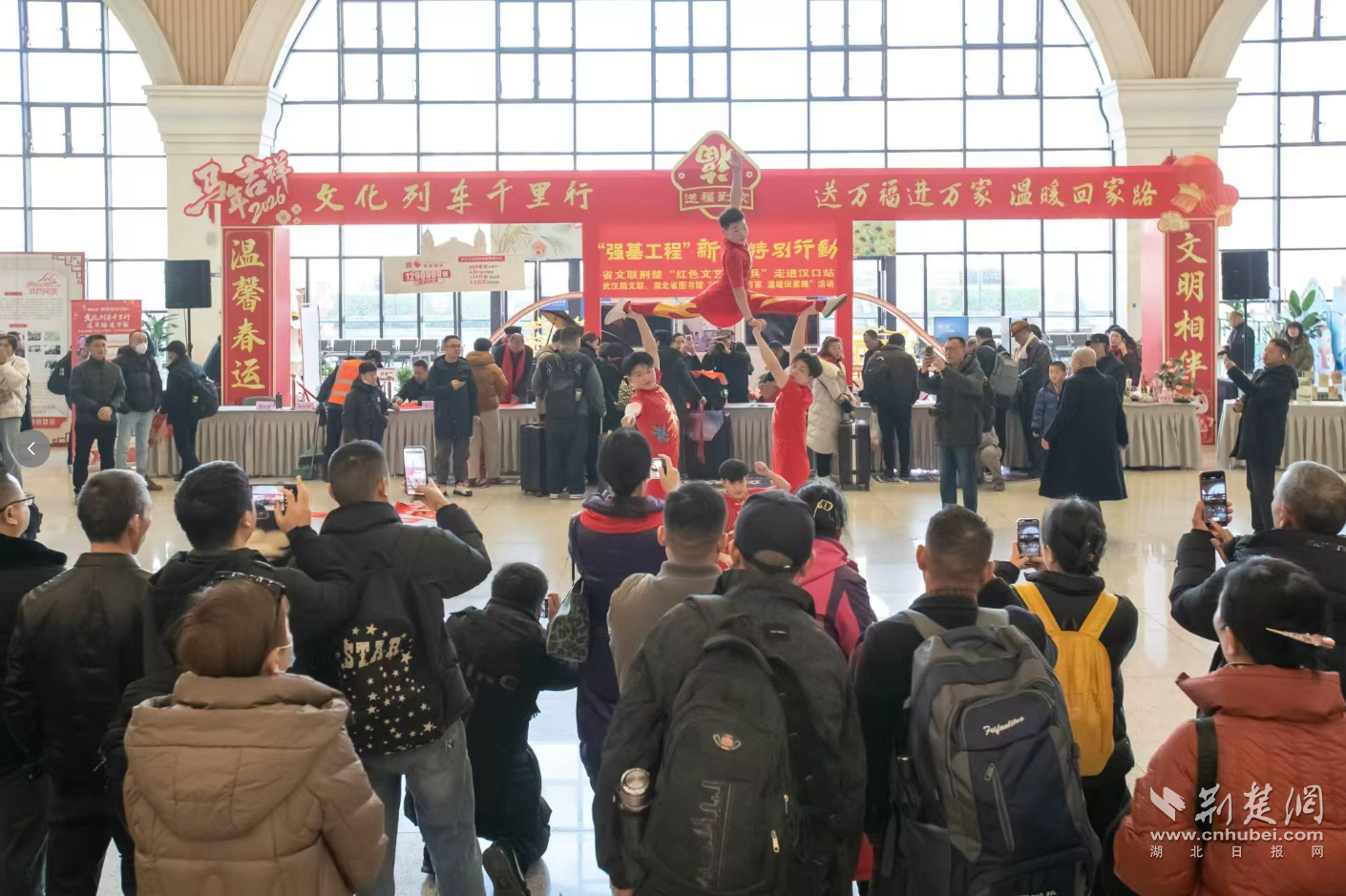 荆楚网(湖北日报网)讯(通讯员王晓飞、鲁佳雯、陈利安)骏马迎春至,站台送福来。 2月2日春运首日,“强基工程”新春特别行动——文化列车千里行系列活动在全省17个市州26个火车站同步启动,为南来北往的旅客送上浓浓的年味与温情祝福。