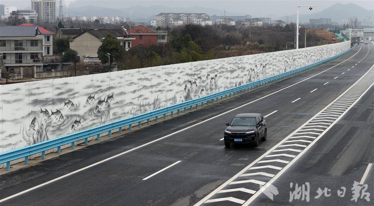2月3日,一辆汽车经过绘有武昌鱼主题壁画的声屏障。(通讯员王可摄)