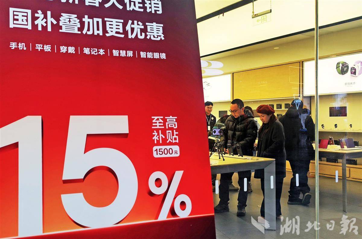 2月1日,在武汉市硚口区一家大型商场,在国补与店家优惠的叠加下,吸引众多市民选购新款手机。