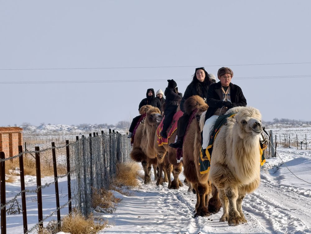 1月29日,台湾青年在新疆体验骑骆驼。新华社记者 贺小童 摄