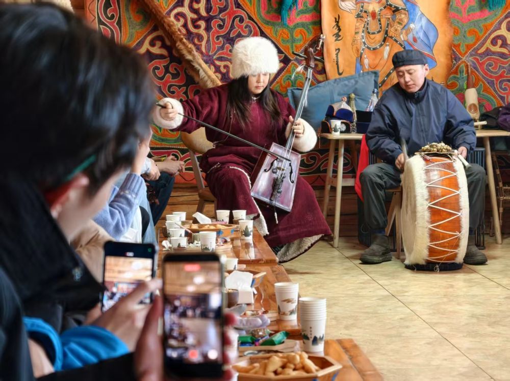1月30日,台湾青年在新疆喀纳斯景区欣赏蒙古族图瓦人演奏。新华社记者 贺小童 摄