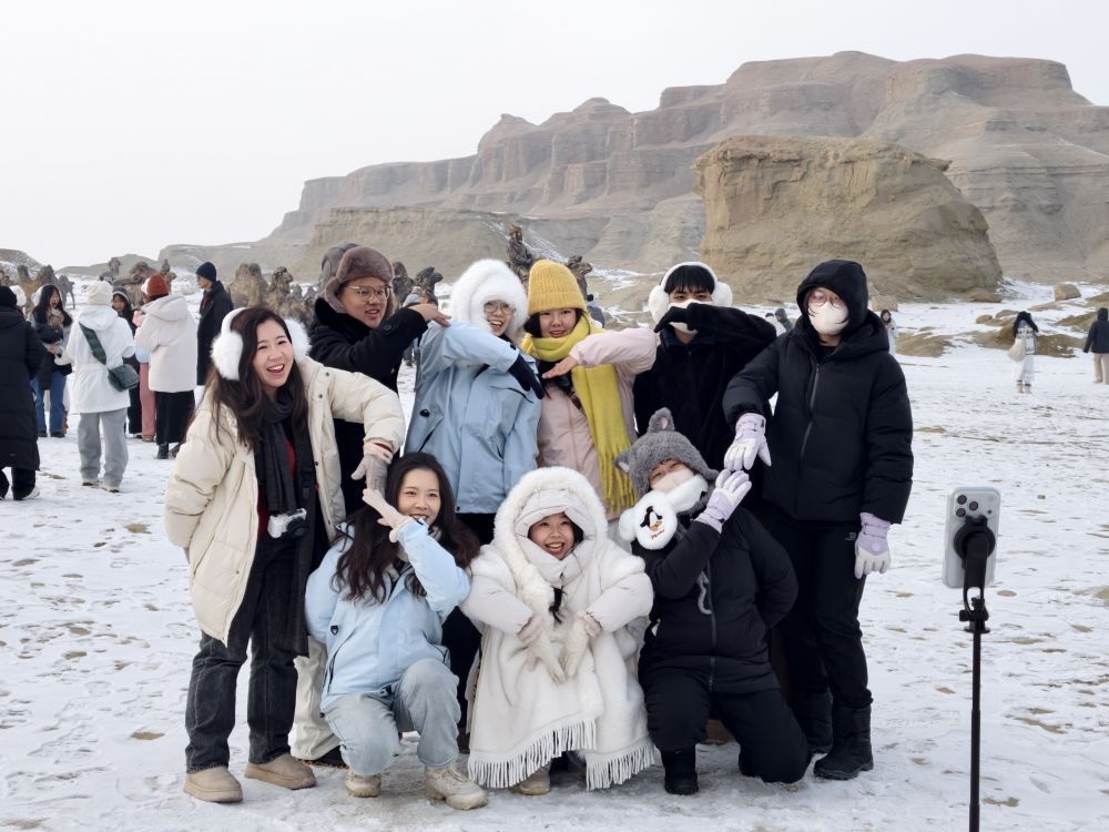 1月28日,台湾青年在新疆克拉玛依市世界魔鬼城景区合影。新华社记者 贺小童 摄