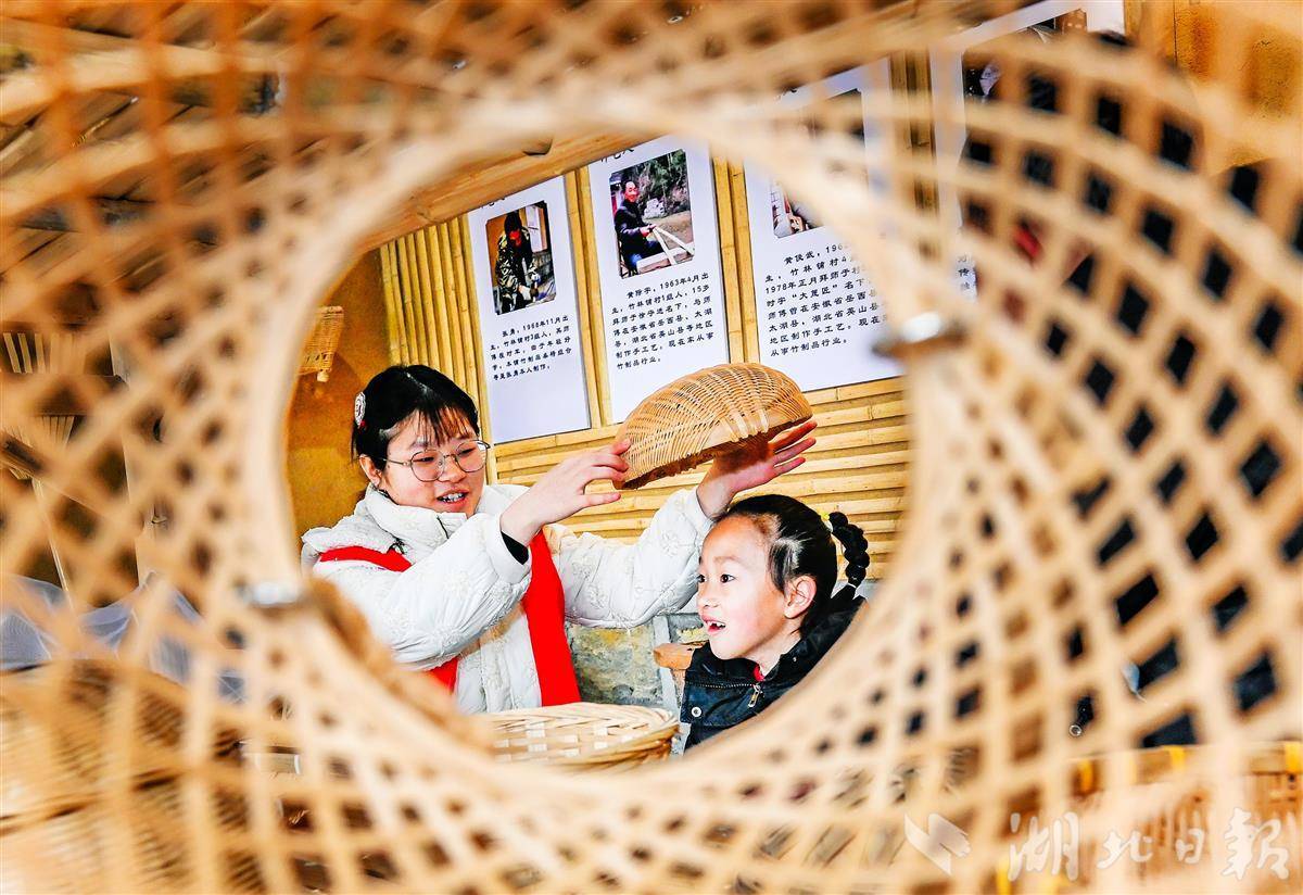 2月1日,在黄冈市英山县杨柳湾镇竹林铺村竹制品展示馆,竹编非遗传承人正为孩子们讲解竹编制品的编织技艺与文化内涵。