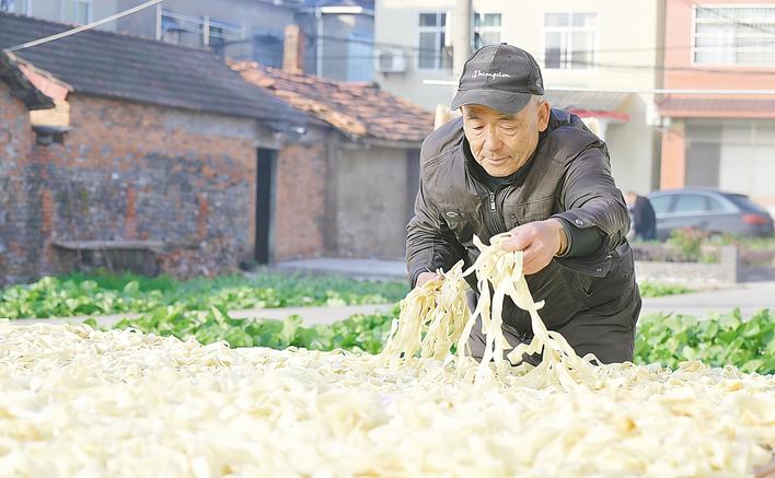 黄雄在晾晒切好的豆饼丝。 (湖北日报通讯员 程智威 摄)