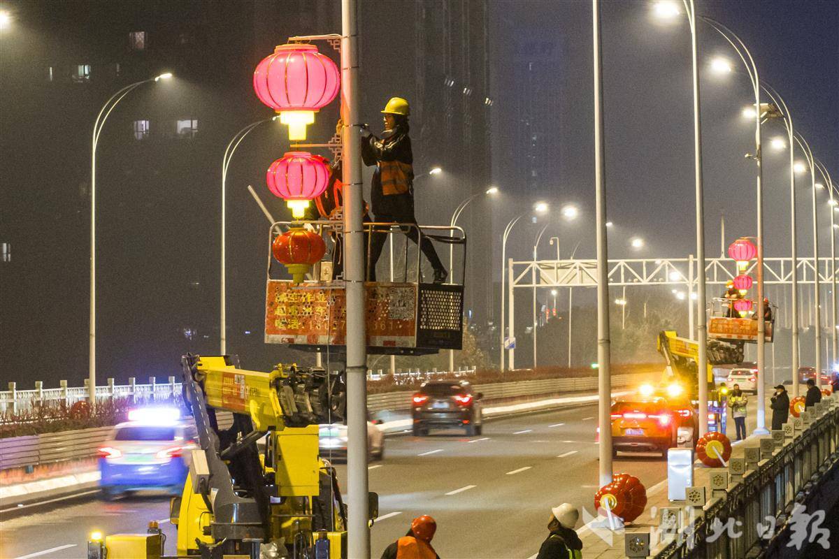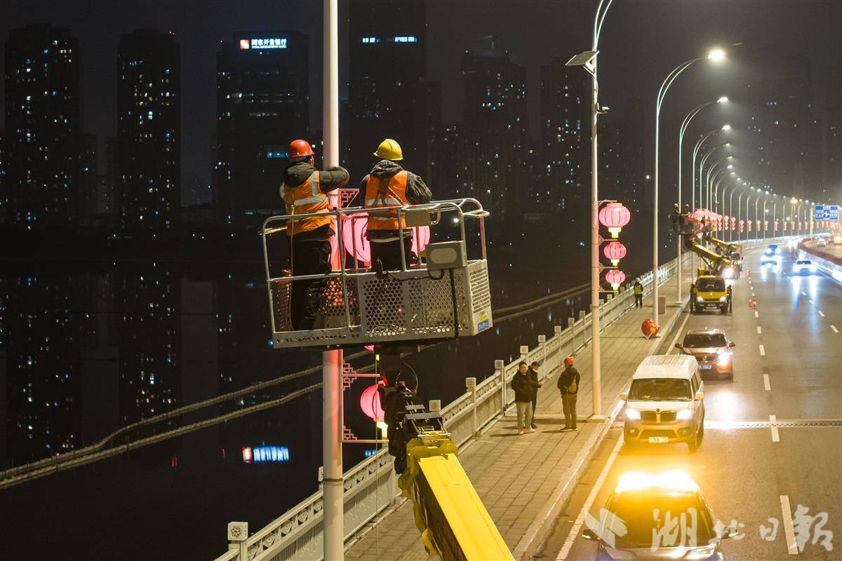 灯笼一挂,年味就来了。2月3日深夜至2月4日凌晨,武汉沙湖大桥161根灯柱上“悄悄”挂满了红灯笼。随着2026年马年春节日益临近,武汉市节日氛围营造工作正式启动。3日晚,武昌区城管组织十余名工人和数台特种车辆同时作业,在主次干道、部分桥梁高架等处统一悬挂大红灯笼等传统民俗装饰,为市民营造喜庆祥和的节日氛围。(湖北日报全媒记者 任勇 通讯员 费帆 李经纬 摄)