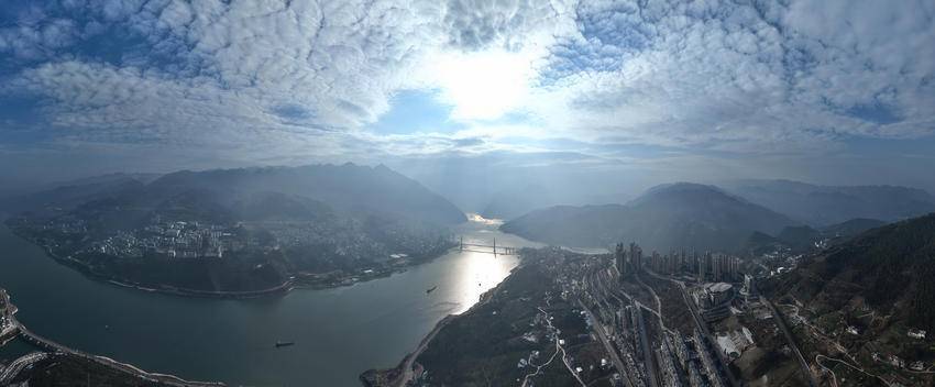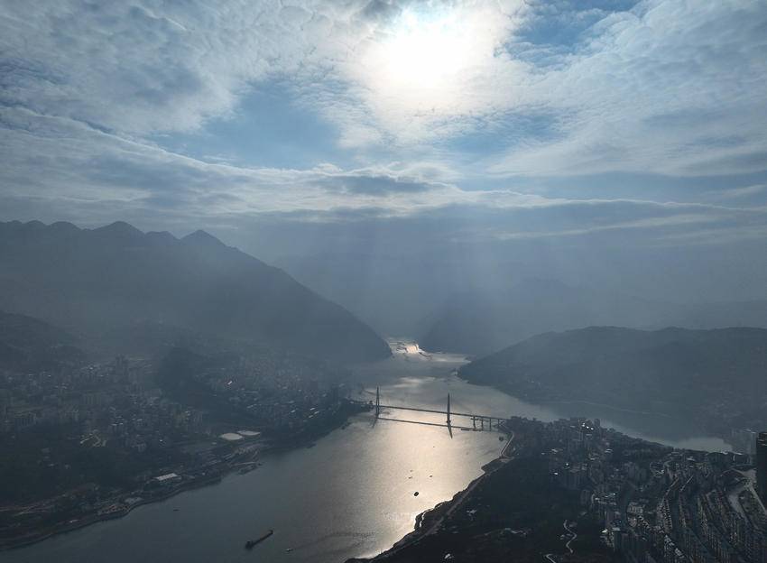 2月3日,长江巴东县巫峡口天空如蓝,白云如絮,一束束白色的丁达尔光从云层缝隙穿透而下,直股股地射向江面,形成一块块流动的光斑,江水秒变颜色,像害羞少女的脸蛋儿变得绯红,讨人欢喜。