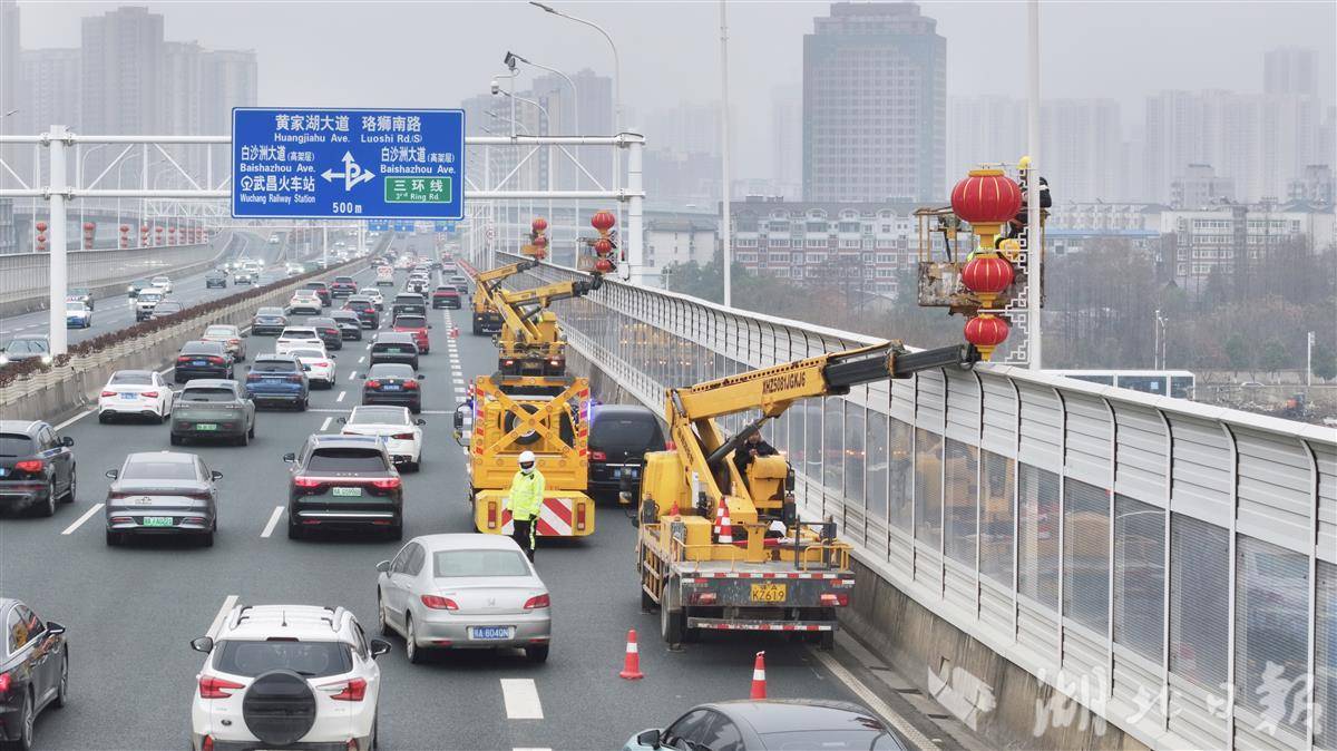 2月4日下午,洪山区城管执法局工作人员在桥体两侧悬挂红灯笼。