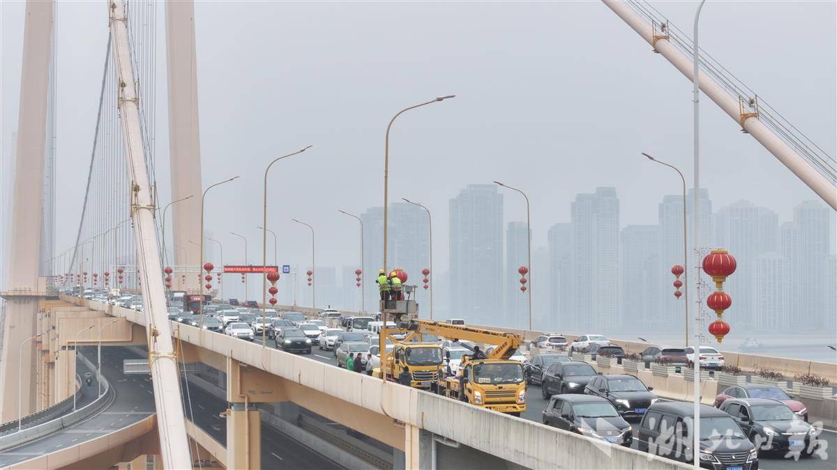 橘色桥体与串串红灯笼交相辉映,形成江面上一道亮眼的风景线。据悉,此次悬挂工作特别选用HDPE(防水防紫外线不褪色)材质灯笼,确保雨雪天气下景观效果持久。一抹抹“中国红”不仅点亮了城市地标,更传递出浓浓年味,为市民提前送上新春祝福。(湖北日报全媒记者 陈少哲 通讯员 谢卓维 摄)