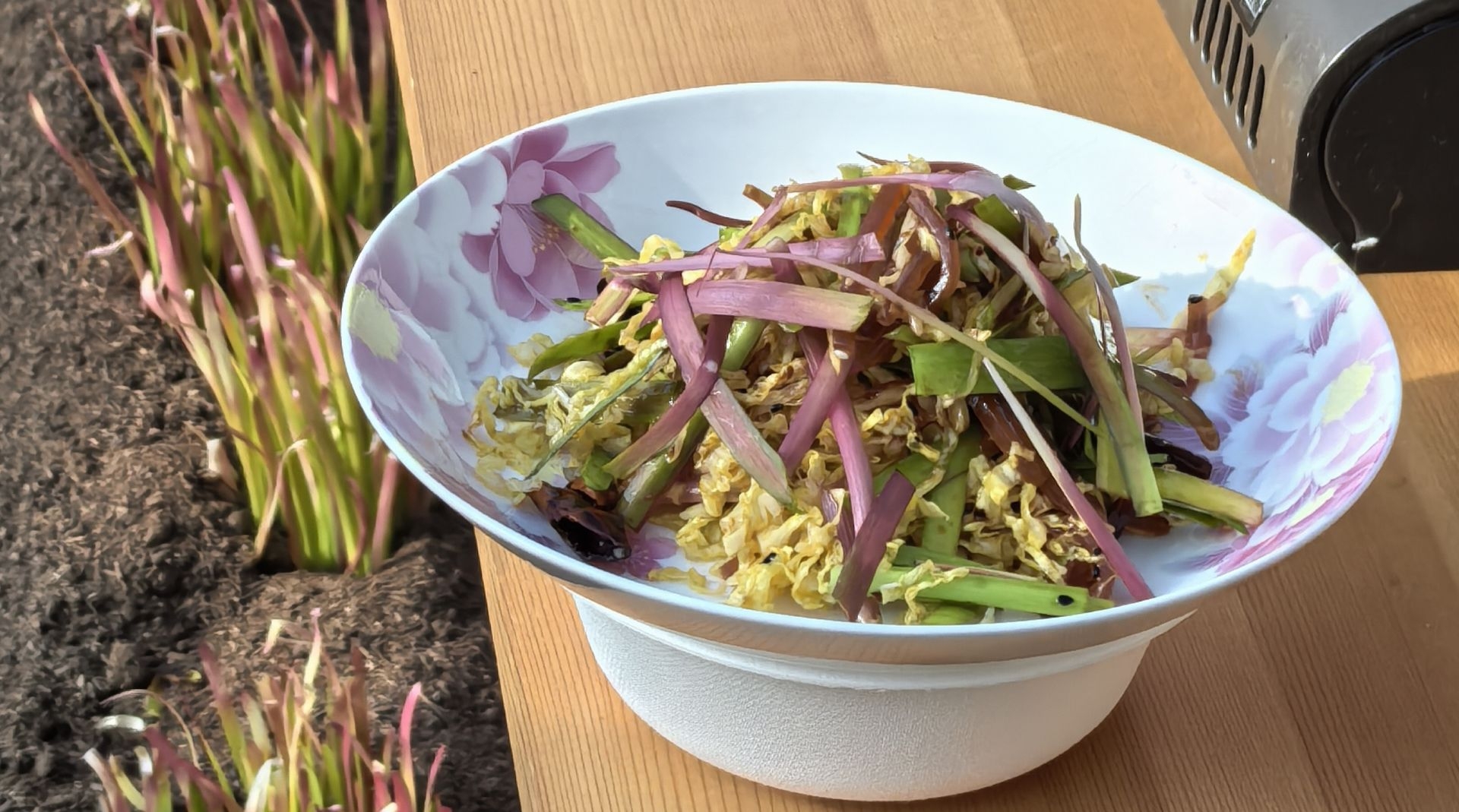 这样的颜色并非品种天生,而是产于一套复杂细致的栽培技艺。在冬季,用特殊的基质层层覆盖韭菜地,精细调控掀盖的时间、厚度来控制温度和光照条件,使其在不同植株部位呈现出丰富的色彩。