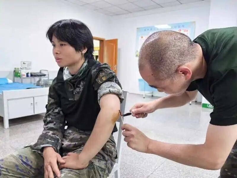 在“轻机枪战场救护后集火打击”训练中,需要模拟战场救护环境,在心肺复苏救护后,拖拽重达百斤的假人通过20米长的低桩网,加上枪支、头盔、装具,总负重接近150斤,随后还要完成目标打击,这不仅是体能的考验,更是意志的锤炼。长时间的训练,让陈新会手肘等部位都磨出了紫块、积液和肿包。