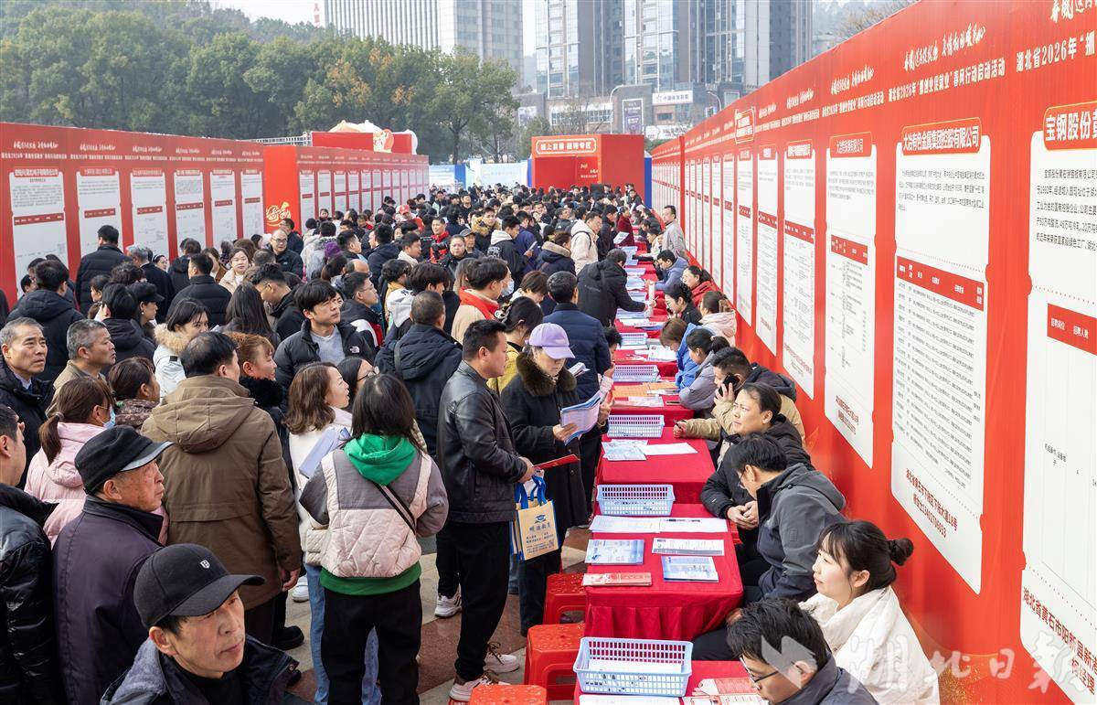 2月4日,湖北省2026年“抓创业促就业”春风行动启动活动在黄石市人民广场举行。200多家企业进场纳贤,提供岗位10000余个,并通过“线上+线下”方式发布招聘信息,吸引众多求职者前来应聘求职。(视界网 周巍 摄)