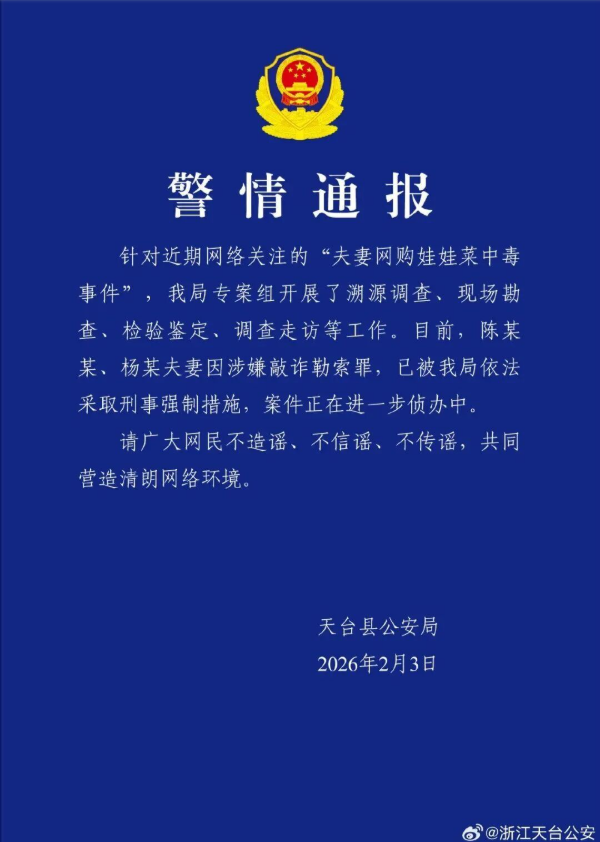 就在舆论围绕“丈夫投毒”争论不休时,2月3日浙江天台县公安局发布通报,这起案件并非家庭投毒案——