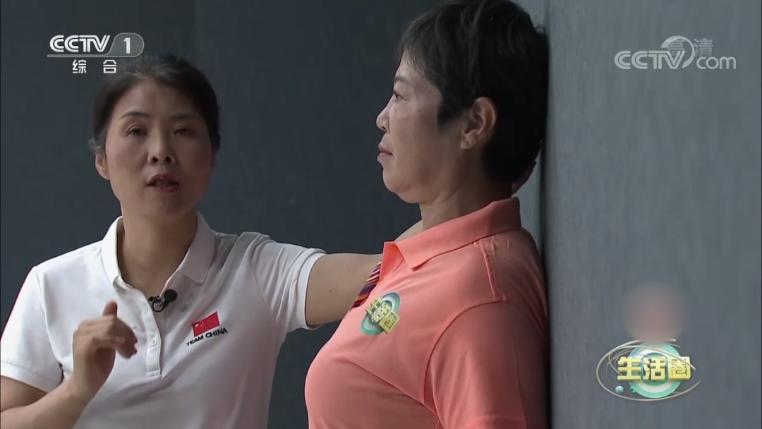 双肩放松下沉,手臂自然下垂,肩胛骨贴靠墙面,肩头尽量贴靠墙面,感觉胸前肌肉有牵拉的感觉。