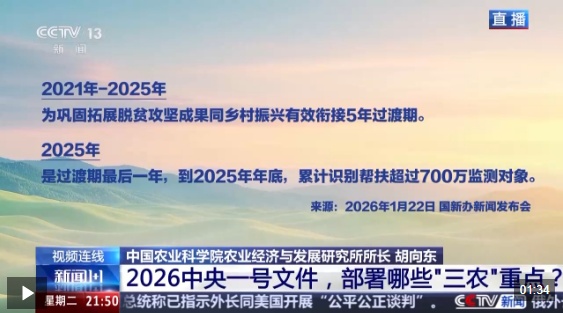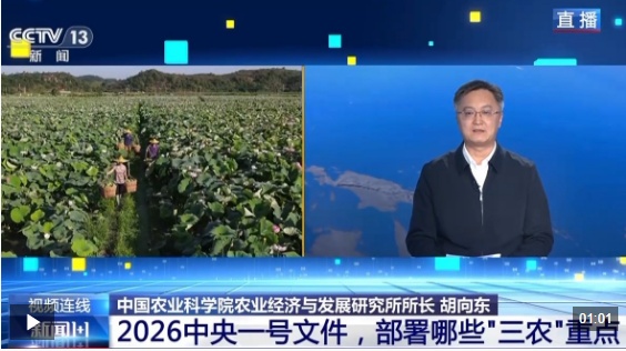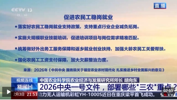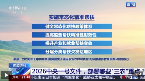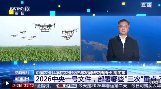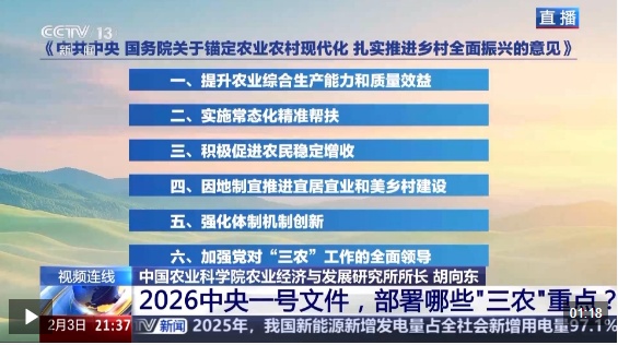2026年中央一号文件2月3日发布,对锚定农业农村现代化、扎实推进乡村全面振兴进行了部署。目前,我国粮食产量已连续两年稳定在1.4万亿斤以上,如何提升农业综合生产能力和质量效益成为重中之重。除了稳定发展粮油生产,文件明确提出加强农业关键核心技术攻关和科技成果高效转化应用。与此同时,文件将实施常态化精准帮扶单独列为一项重要工作任务,强调要培育壮大县域富民产业、促进农民工稳岗就业。保障粮食安全如何再升级?现代农业科技要如何提高效能?常态化精准帮扶机制如何有效建立?《新闻1+1》本期节目连线中国农业科学院农业经济与发展研究所所长胡向东,进行解读。
