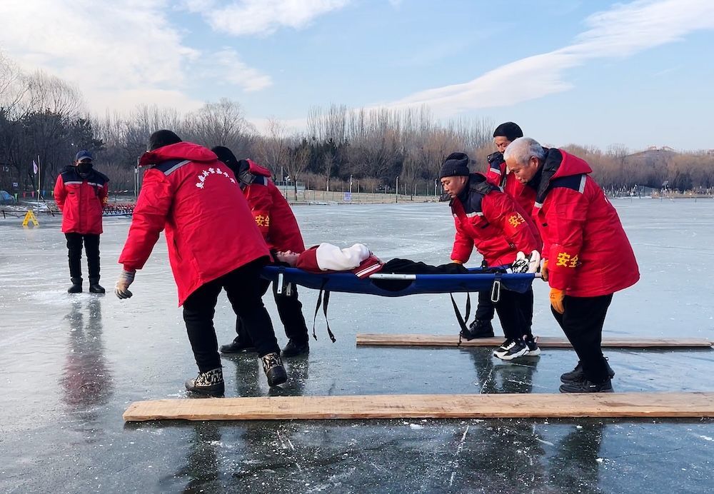 2026年1月18日,奥森公园冰场,刘彪扛着标杆在冰面上巡查风险点。