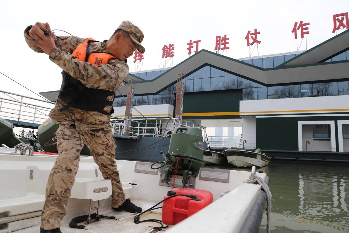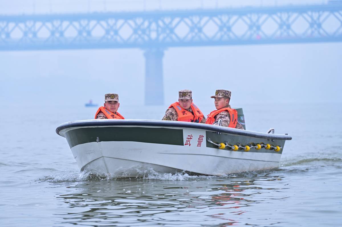 官兵们在江面巡逻。