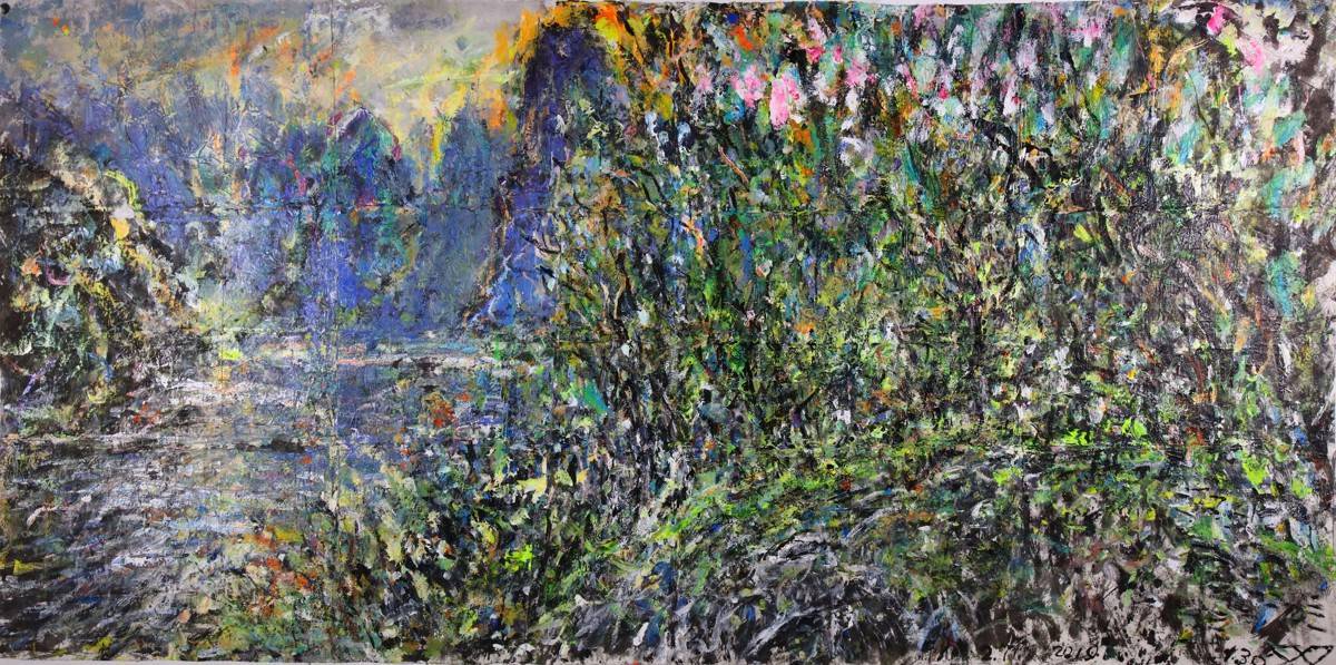 2019年,李玉双再度来到桂林写生。距离父子共同完成《漓江》水墨已经过去了四十多年,此时的李玉双已经进入了一种高度自由的状态,不再拘泥于传统写实画法。再次站在漓江前,他使用宣纸,却混合丙烯、色粉,为传统媒介注入现代色彩的强烈张力,画出了色彩斑斓的《桂林阳朔》。