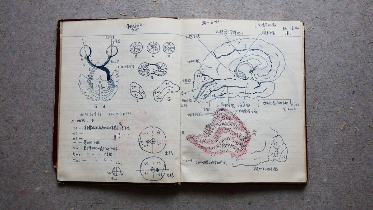 展柜中陈列着他自制的视觉模型,试图模拟光线如何通过眼睛在大脑成像。旁边是密密麻麻的“鲁山笔记”,写满了光学公式、视觉原理和艺术思考。
