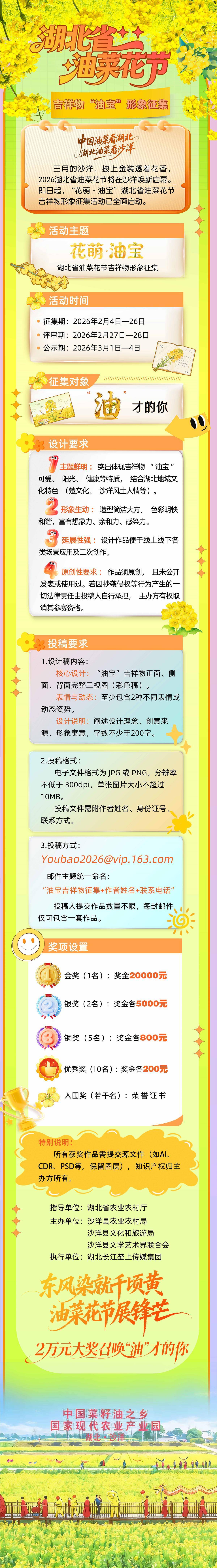 湖北日报讯(记者祝华、通讯员张思)中国油菜看湖北,湖北油菜看沙洋。三月的沙洋,披上金装,透着花香。2026湖北省油菜花节将在此焕新启幕,吉祥物“油宝”也将在活动现场闪耀亮相。