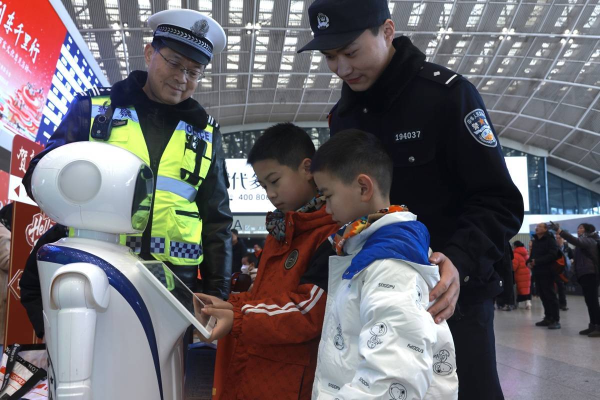 小朋友们在武汉站派出所民警的指导下同“警宝”机器人互动。