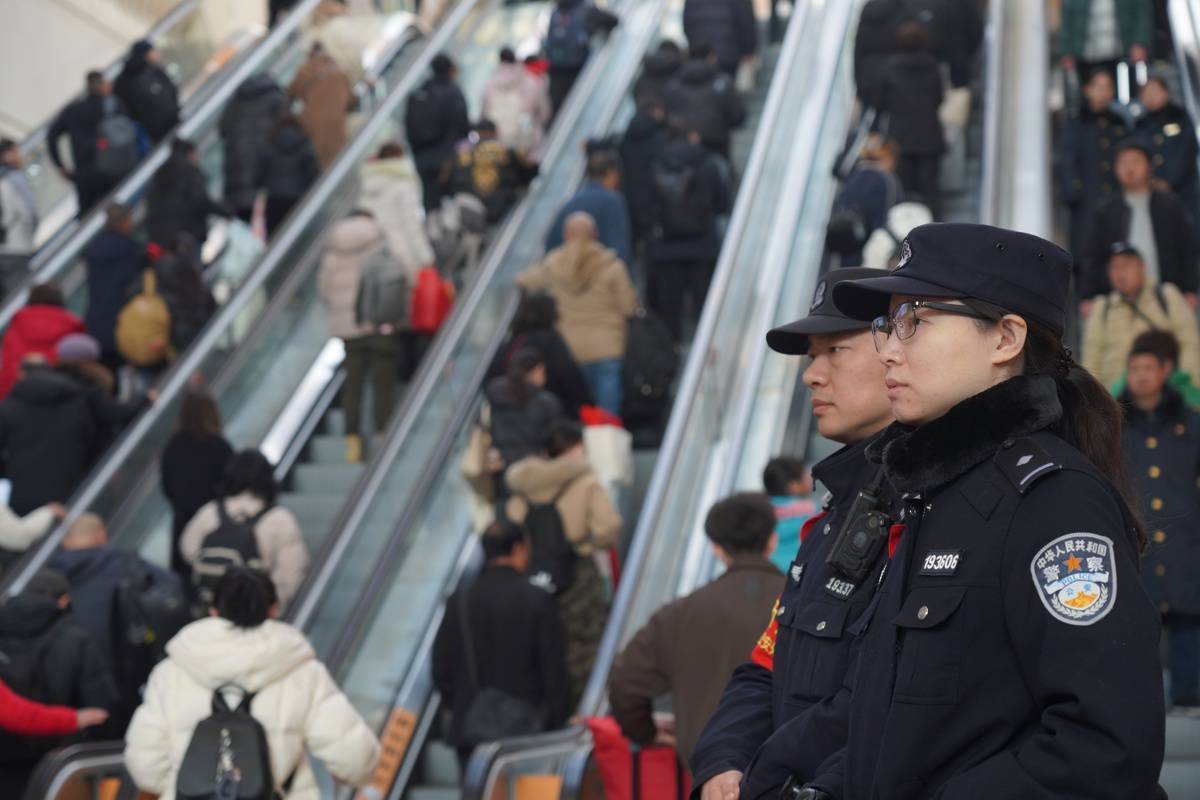 武汉铁路公安处汉口站派出所民警在车站立岗执勤,护航旅客春运平安出行。