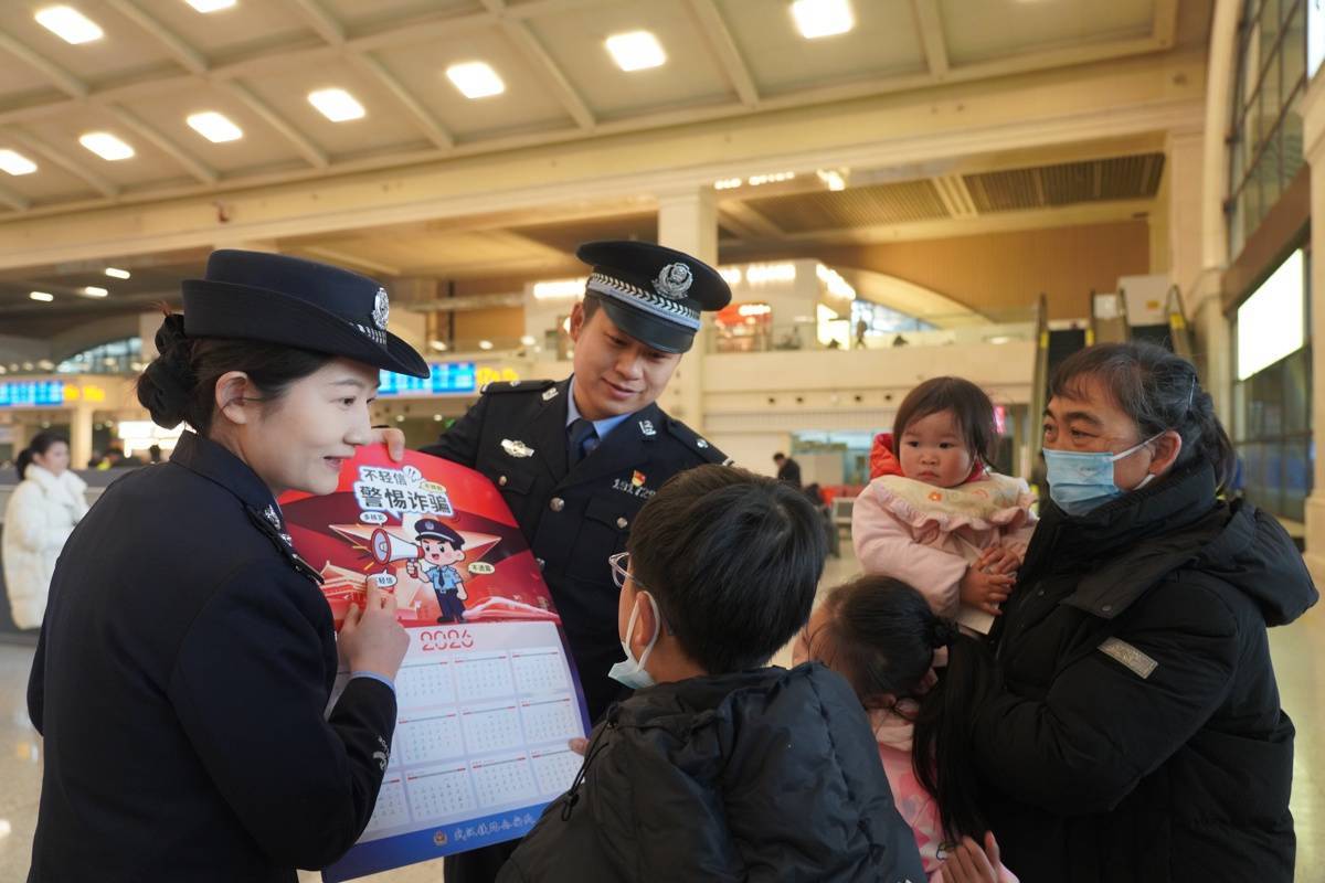 武汉铁路公安处汉口站派出所民警在汉口火车站候车室开展“送新年挂历,讲反诈宣传”活动,守牢来往旅客“钱袋子”。