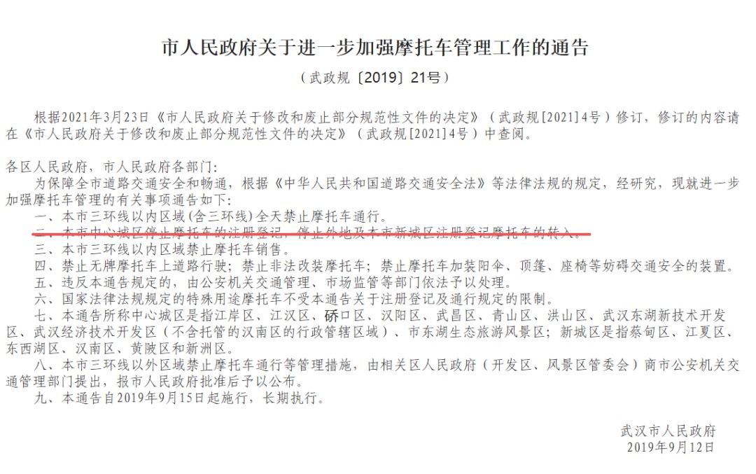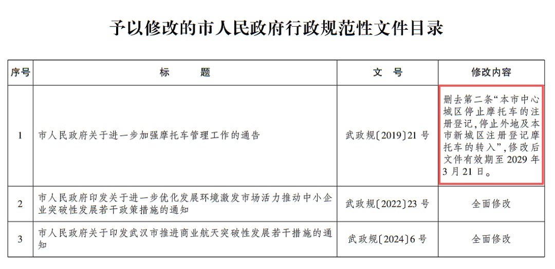 根据武汉市人民政府关于行政规范性文件清理结果的决定,对于2019年开始执行的《市人民政府关于进一步加强摩托车管理工作的通告》(武政规〔2019〕21号)进行了修改。删除了《市人民政府关于进一步加强摩托车管理工作的通告》中“本市中心城区停止摩托车的注册登记,停止外地及本市新城区注册登记摩托车的转入。”的条款,修改后文件有效期延长至2029年3月21日。