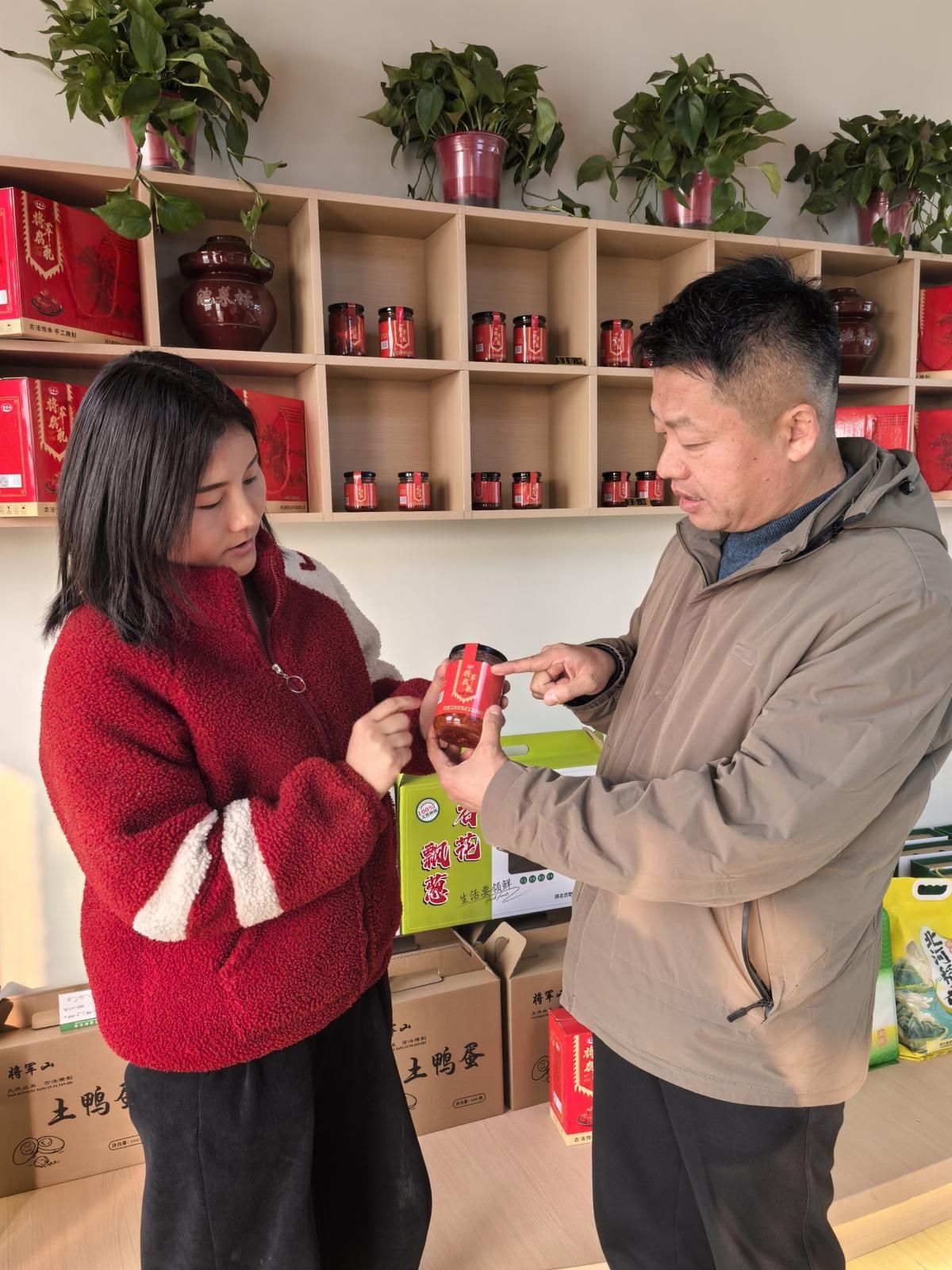 大棚里早就是一片热火朝天,村民们猫着腰、弓着背,小心翼翼地把甘薯苗栽进松软的泥土里;每栽一株,都像是把致富的盼头稳稳扎进了腰包;在不远处的加工厂,村民们手脚麻利地用古法腌制咸鸭蛋,脸上满是急着赶订单的欣喜;展销大厅里更热闹,石花飘葱、将军腐乳一字排开,裹着乡土的香气,混着过年的喜气。