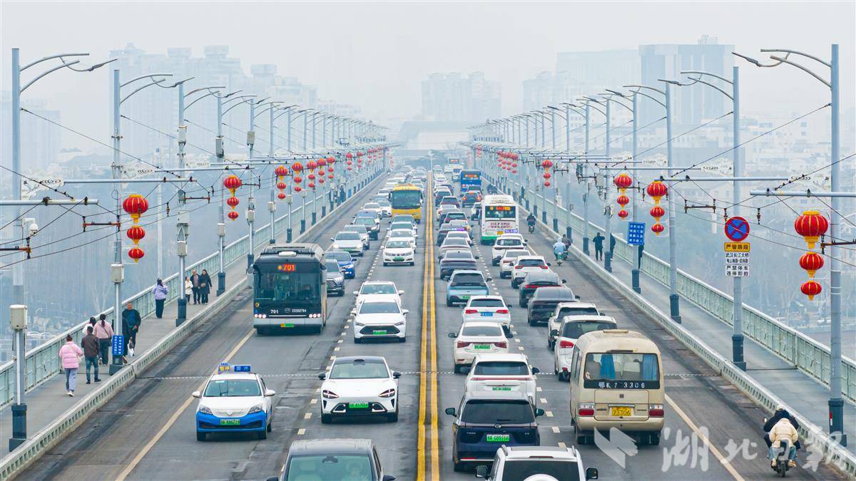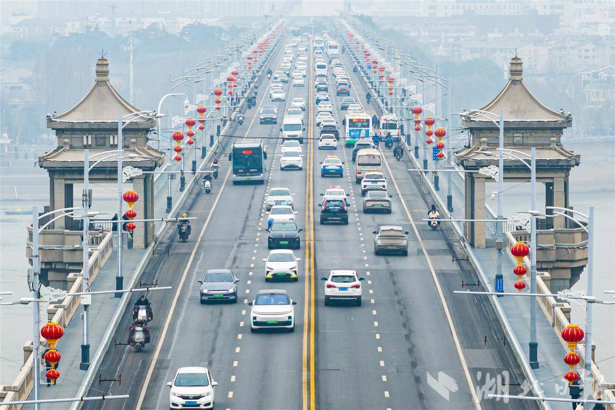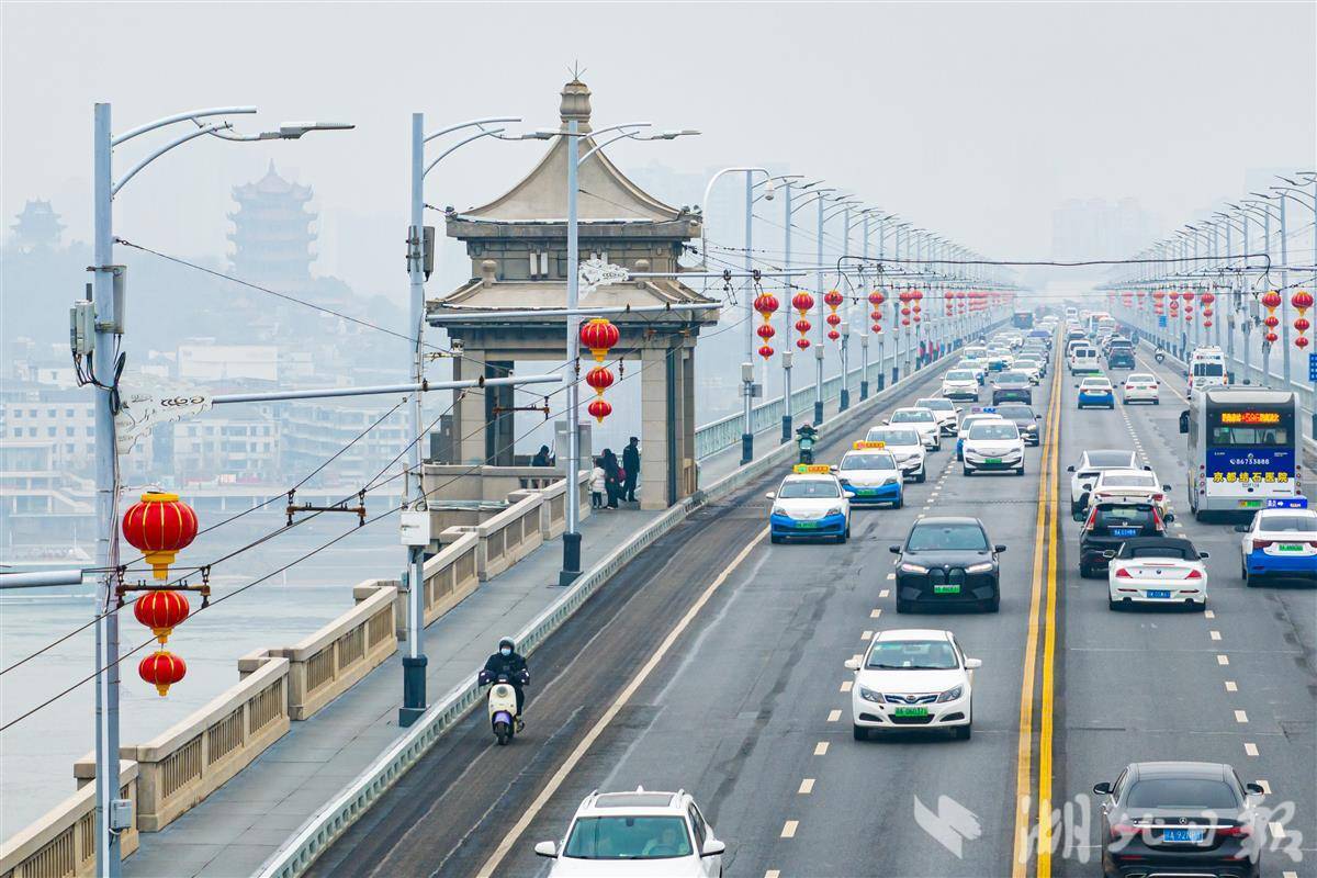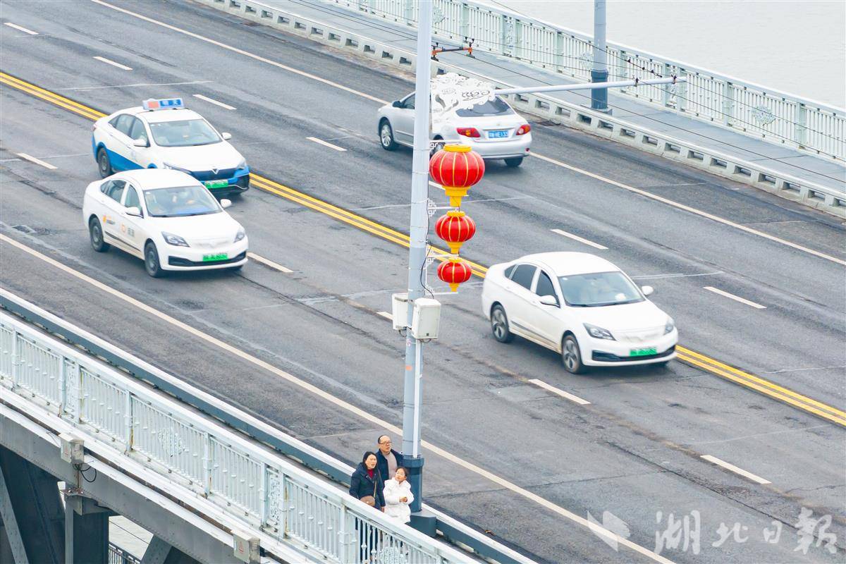 2月5日,一串串大红灯笼挂满武汉长江大桥,传统“中国红”与武汉地标交相辉映。(湖北日报全媒记者 任勇 摄)