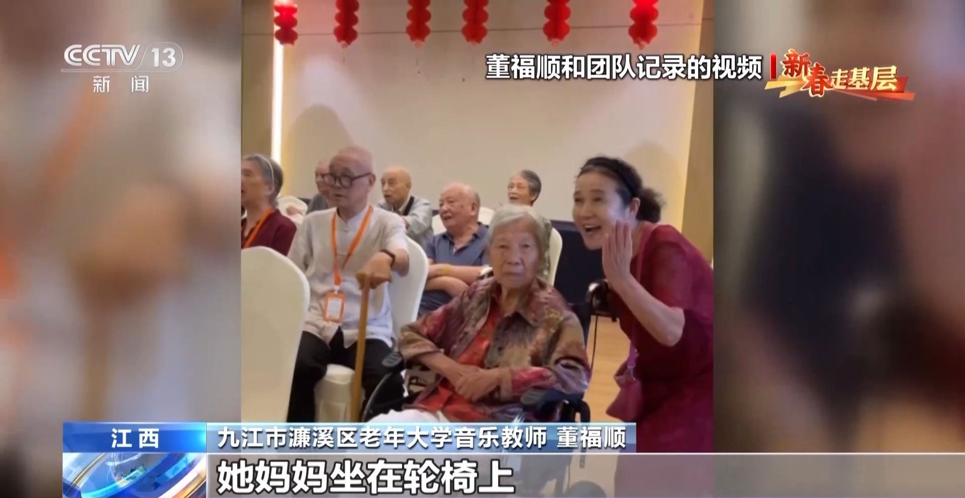 九江市濂溪区老年大学音乐教师 董福顺:这个孩子,她妈妈坐在轮椅上,孩子扶着轮椅,在给她妈妈挥手,打着拍子去一起把这首歌唱完。