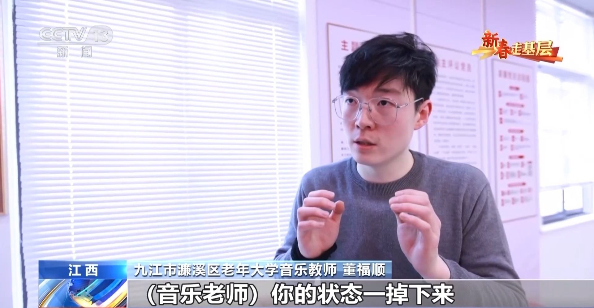 九江市濂溪区老年大学音乐教师 董福顺:我去了之后,他们说我四十年没有开口唱过歌,已经很久很久,他们说都快忘了这首歌的歌词了,你过来了,让我想起了它。所以我觉得我又一次被认可了,我也觉得是他们在给我一点能量,当看着他们唱回忆起的这些歌曲的时候,他们坐直了,开始朝我挥手去唱,我觉得这件事做对了。
