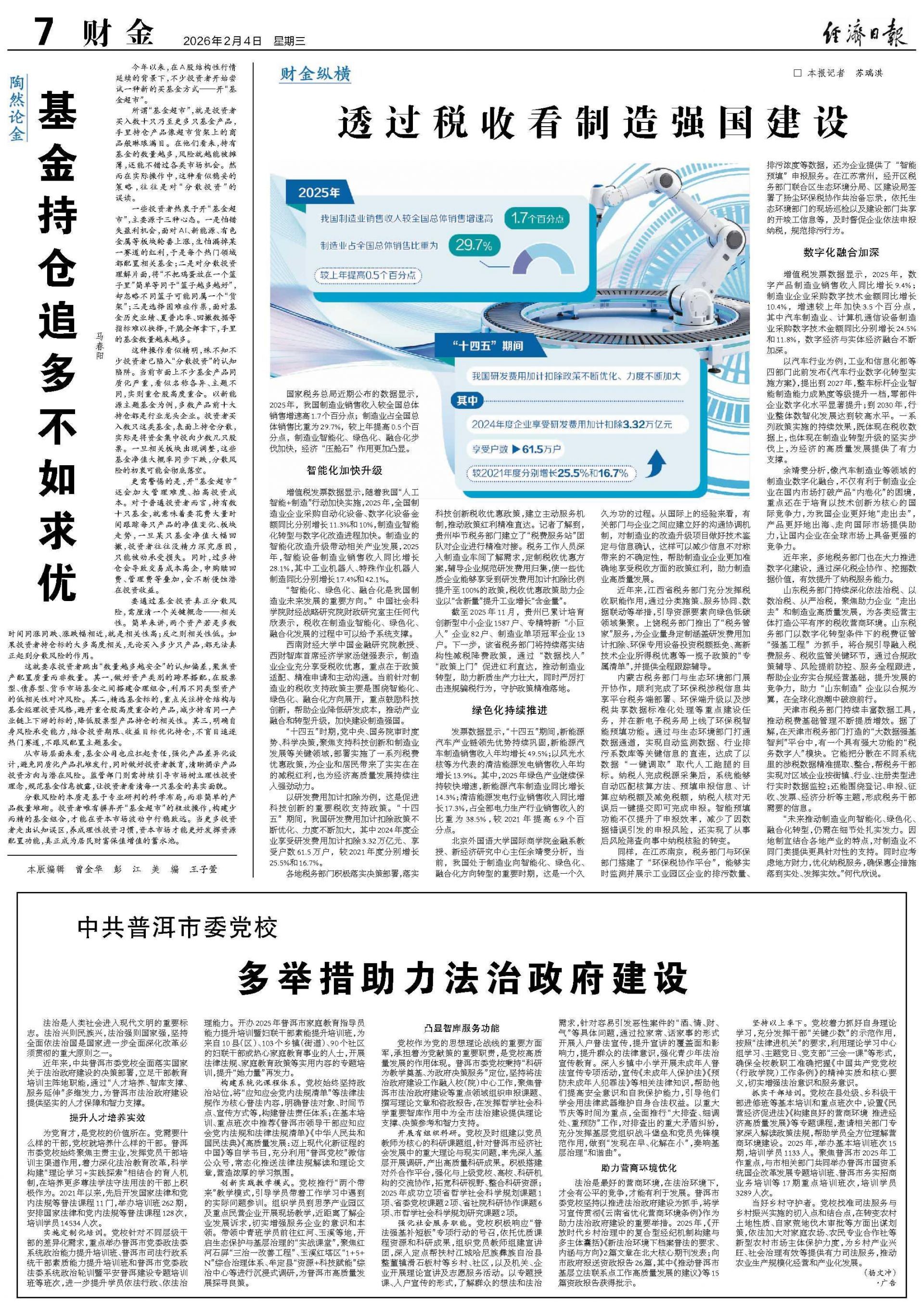 以汽车行业为例,工业和信息化部等四部门此前发布《汽车行业数字化转型实施方案》,提出到2027年,整车标杆企业智能制造能力成熟度等级提升一档,零部件企业数字化水平显著提升;到2030年,行业整体数智化发展达到较高水平。一系列政策实施的持续效果,既体现在税收数据上,也体现在制造业转型升级的坚实步伐上,为经济的高质量发展提供了有力支撑。