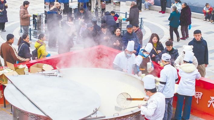 2月6日,宜昌市点军区文鼎广场,首届“点军大集·江南潮玩年货季”热闹启幕。特色小吃区集中展示了30多种荆楚风味,农家腊肉、传统小吃等琳琅满目。一口直径近两米的巨型铁锅热气腾腾,奶白鱼汤咕嘟作响。厨师们精心制作肥鱼汤,免费赠送给市民游客品尝。