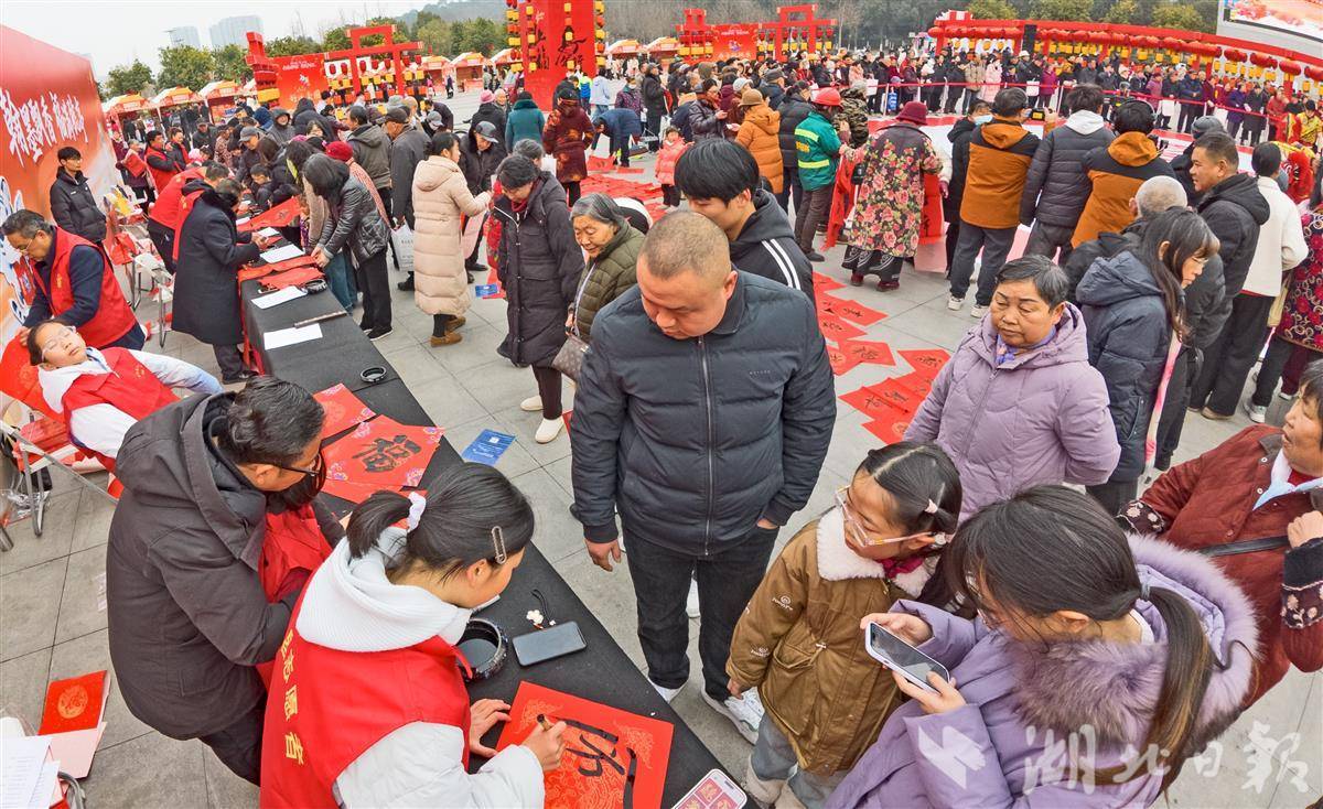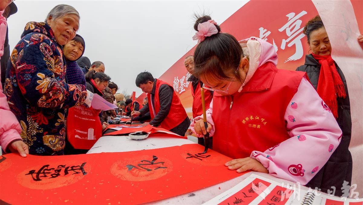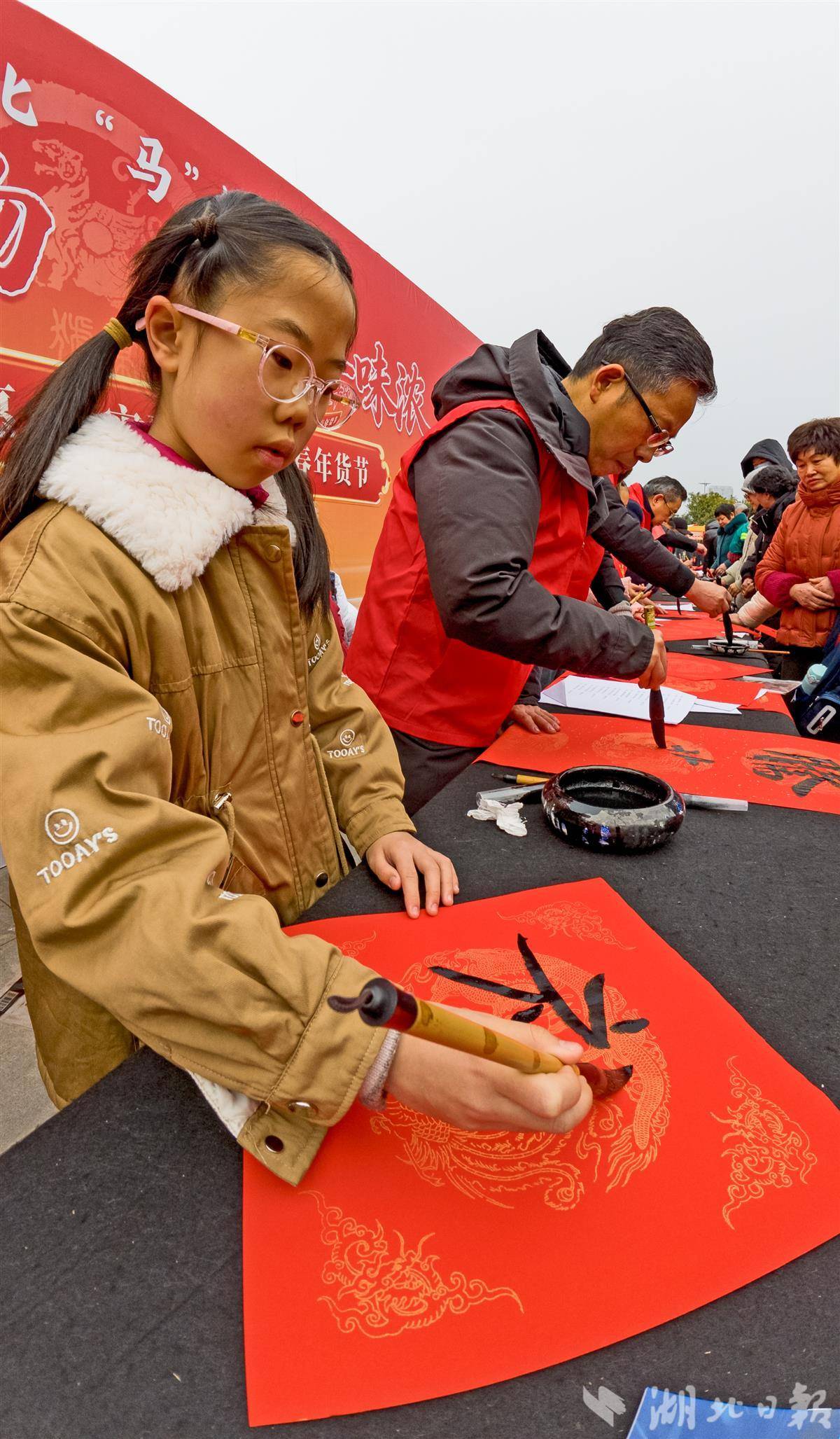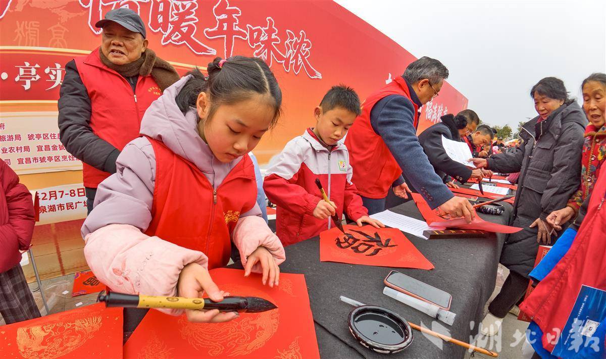 2月7日,宜昌市猇亭区六泉湖广场暖意融融。一批爱好书法的孩子现场挥毫,为市民书写春联,送上新春祝福。