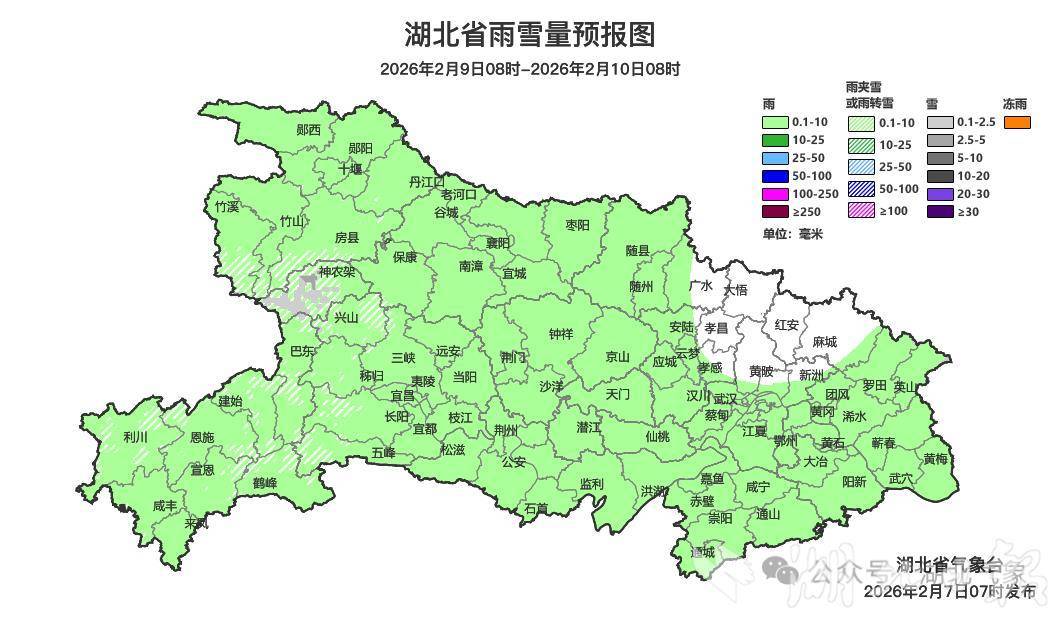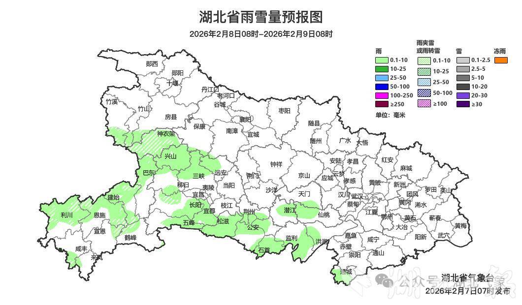 湖北日报讯(记者曾莉)2月6日,随着新一轮冷空气南下,湖北大风、降温、阴雨齐上阵。7日冷空气影响进入尾声,东部地区阴雨停歇,上午仅鄂西有小雨飘洒。不过,新一轮雨雪降温已经“定档”,9日全省大部地区将有小雨,鄂西高山区有雨夹雪或雪。
