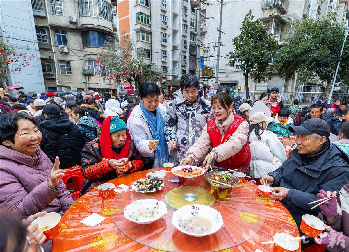 2月7日,黄石市下陆区青龙山社区举行百家团圆宴活动,社区居民相聚在一起尝百家宴,叙邻里情,喜迎新春佳节。(视界网 周巍 摄)