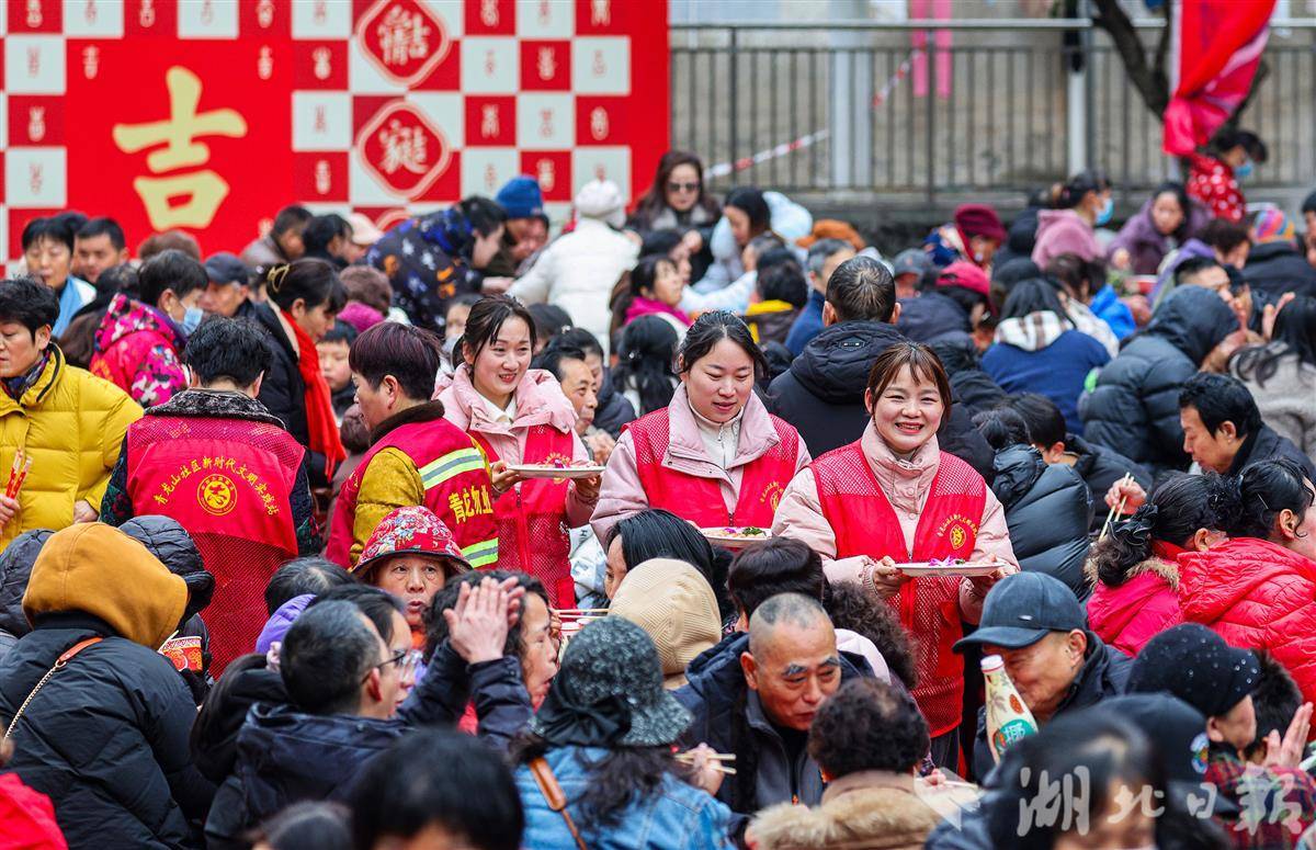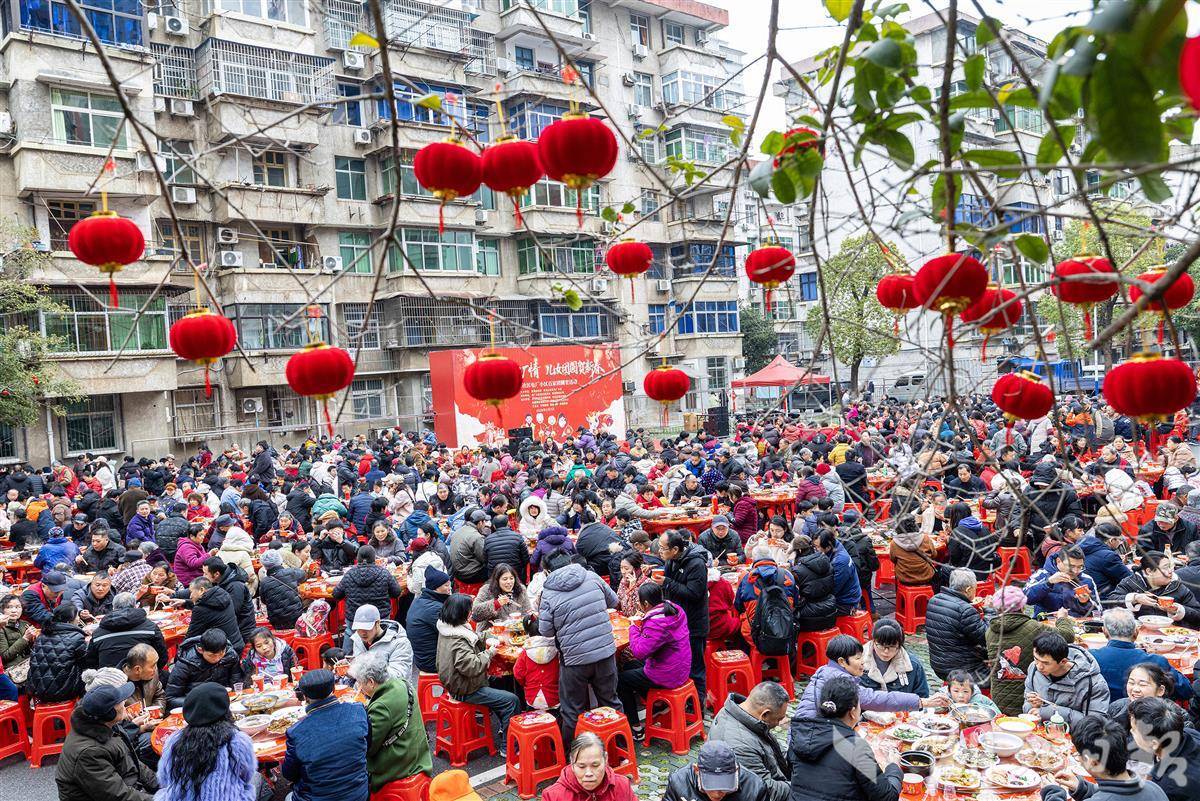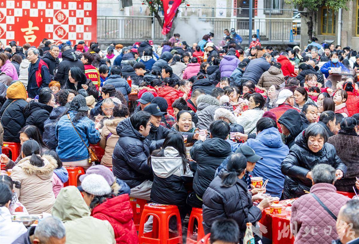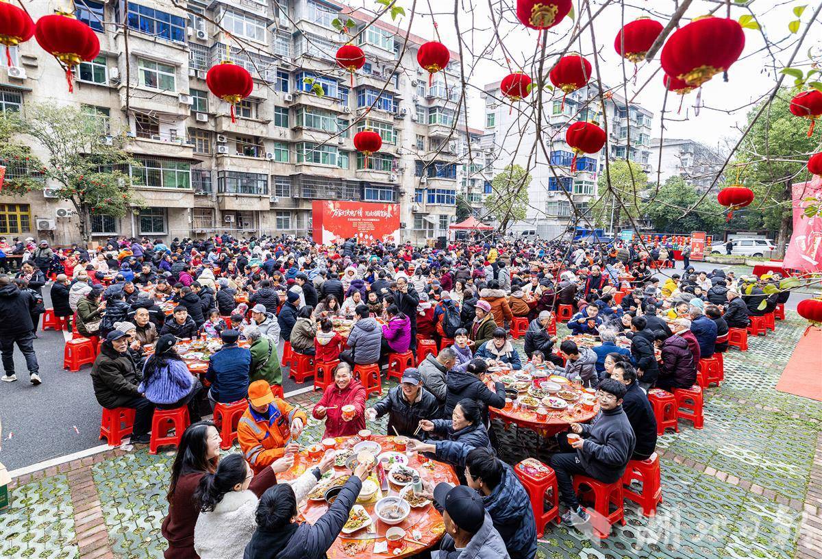 2月7日,黄石市下陆区青龙山社区举行百家团圆宴活动,社区居民相聚在一起尝百家宴,叙邻里情,喜迎新春佳节。