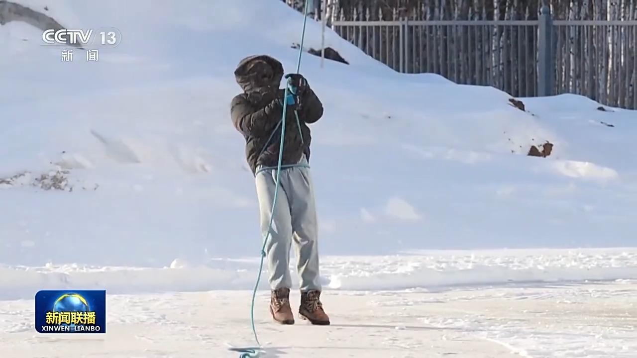 在天线罩顶部固定上几根除雪绳,靠绳子的摩擦力来除雪,对体力是不小的考验。个头小的工程师只能把绳子绑在身上,用全身的重量与冰雪角力。